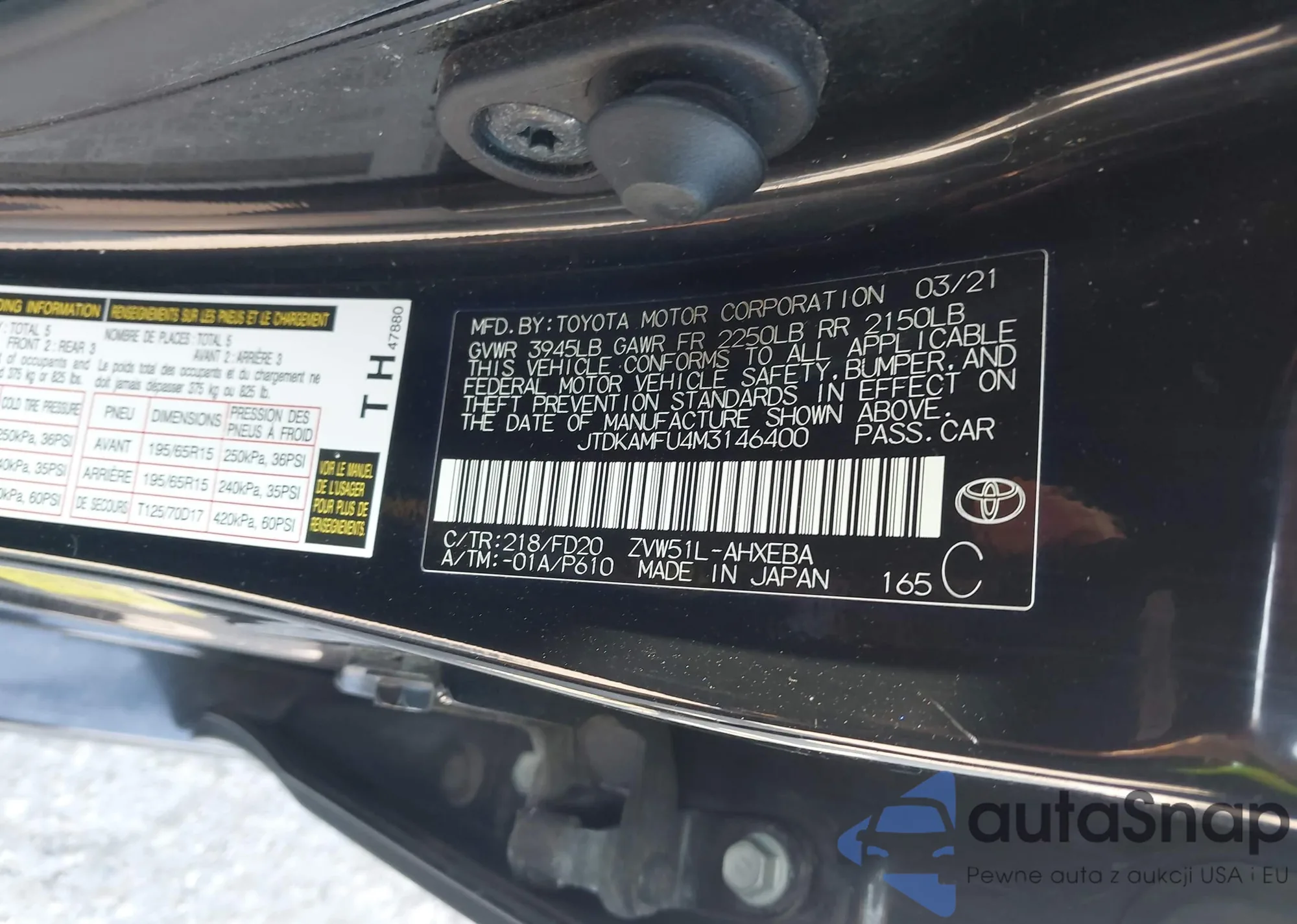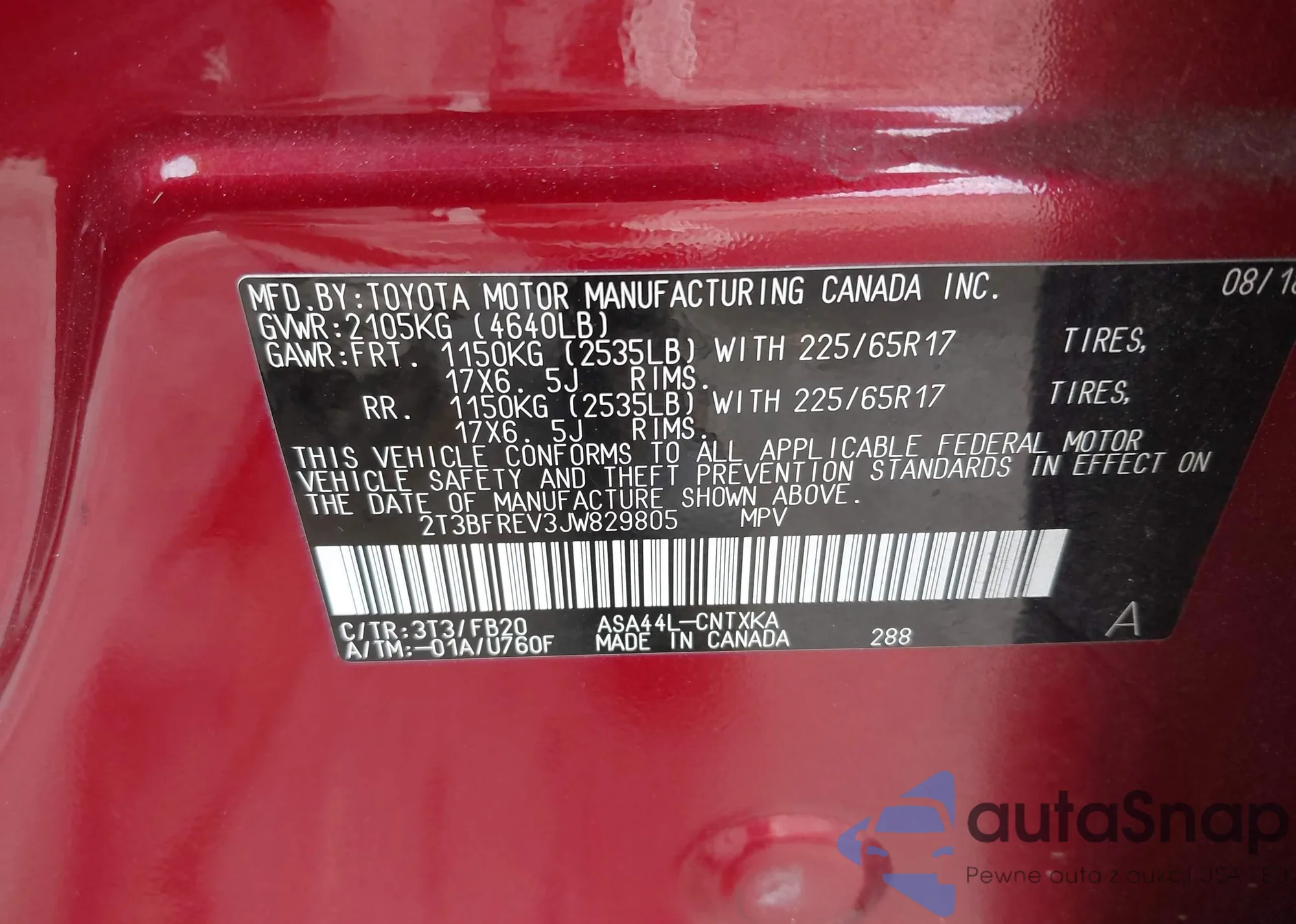 LOT: 43418381 VIN: 2T3BFREV3JW829805