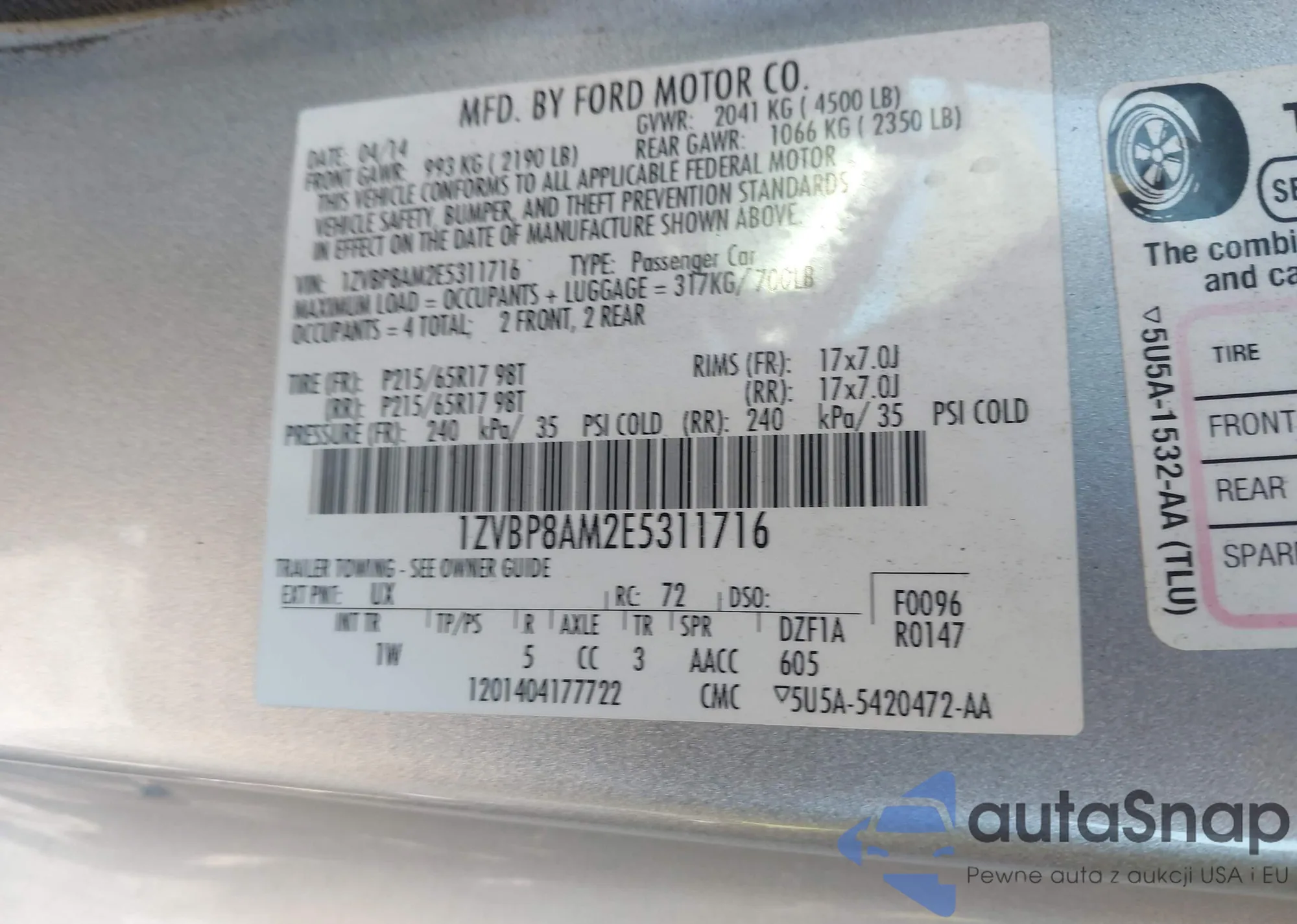 LOT: 43419882 VIN: 1ZVBP8AM2E5311716