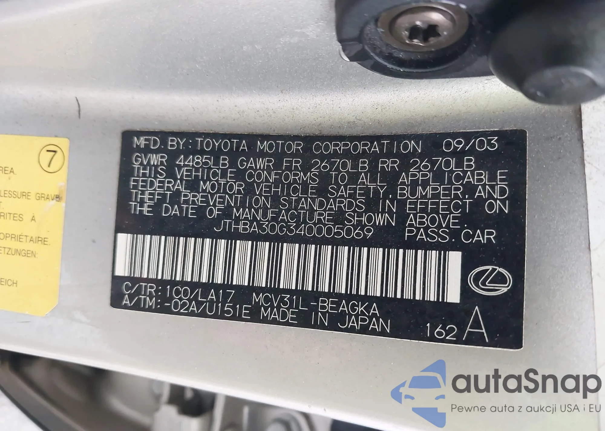 LOT: 43610482 VIN: JTHBA30G340005069