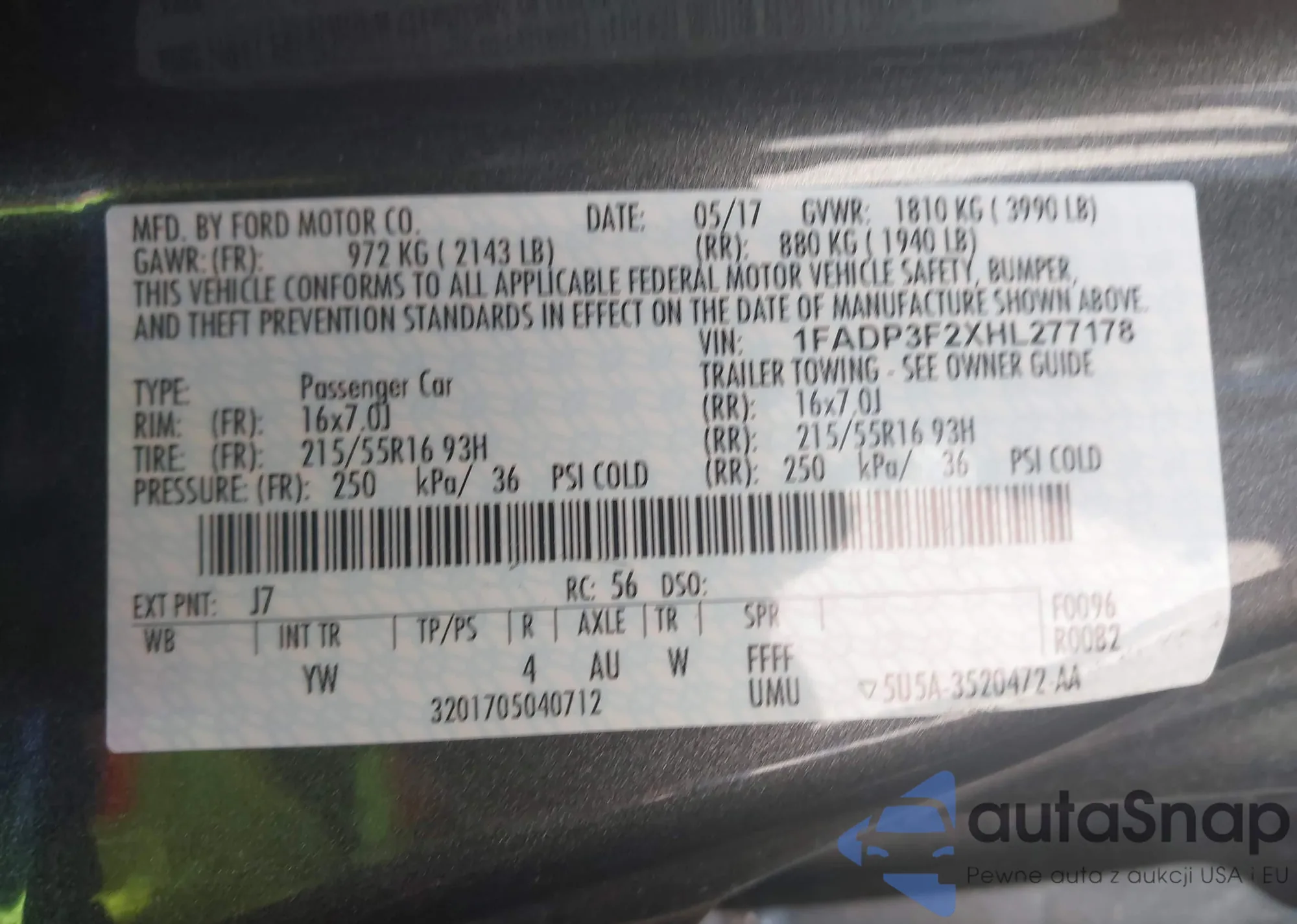• VIN 1FADP3F2XHL277178