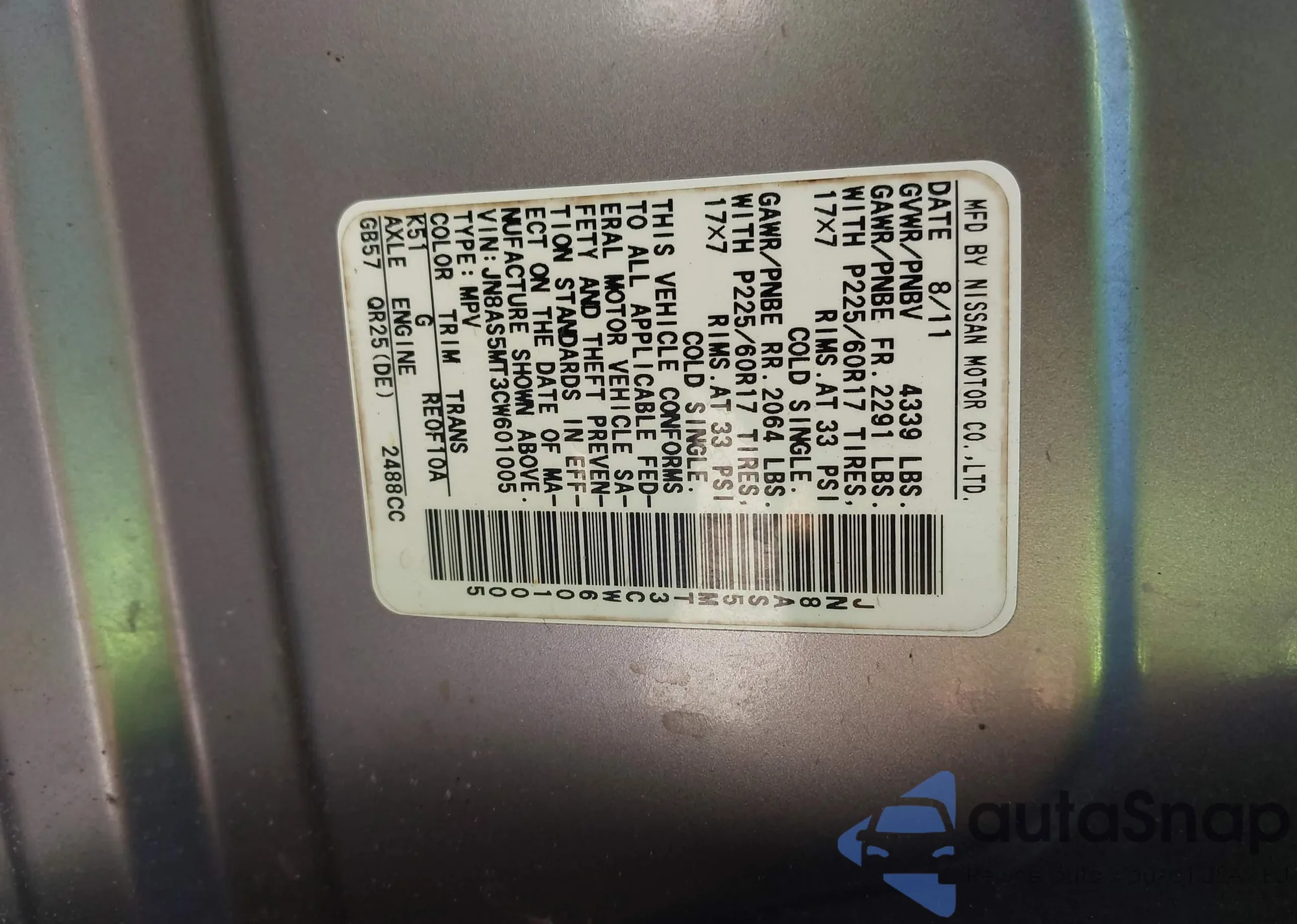 LOT: 43336028 VIN: JN8AS5MT3CW601005