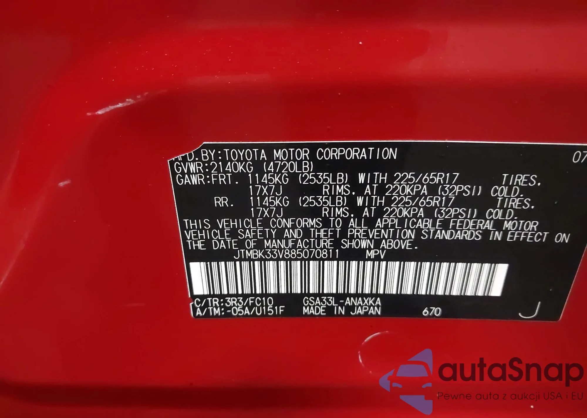 LOT: 43373026 VIN: JTMBK33V885070811