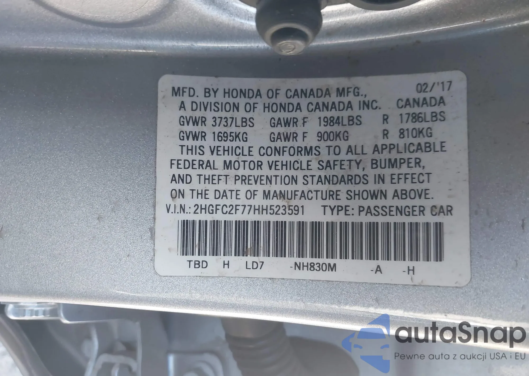 LOT: 43419771 VIN: 2HGFC2F77HH523591