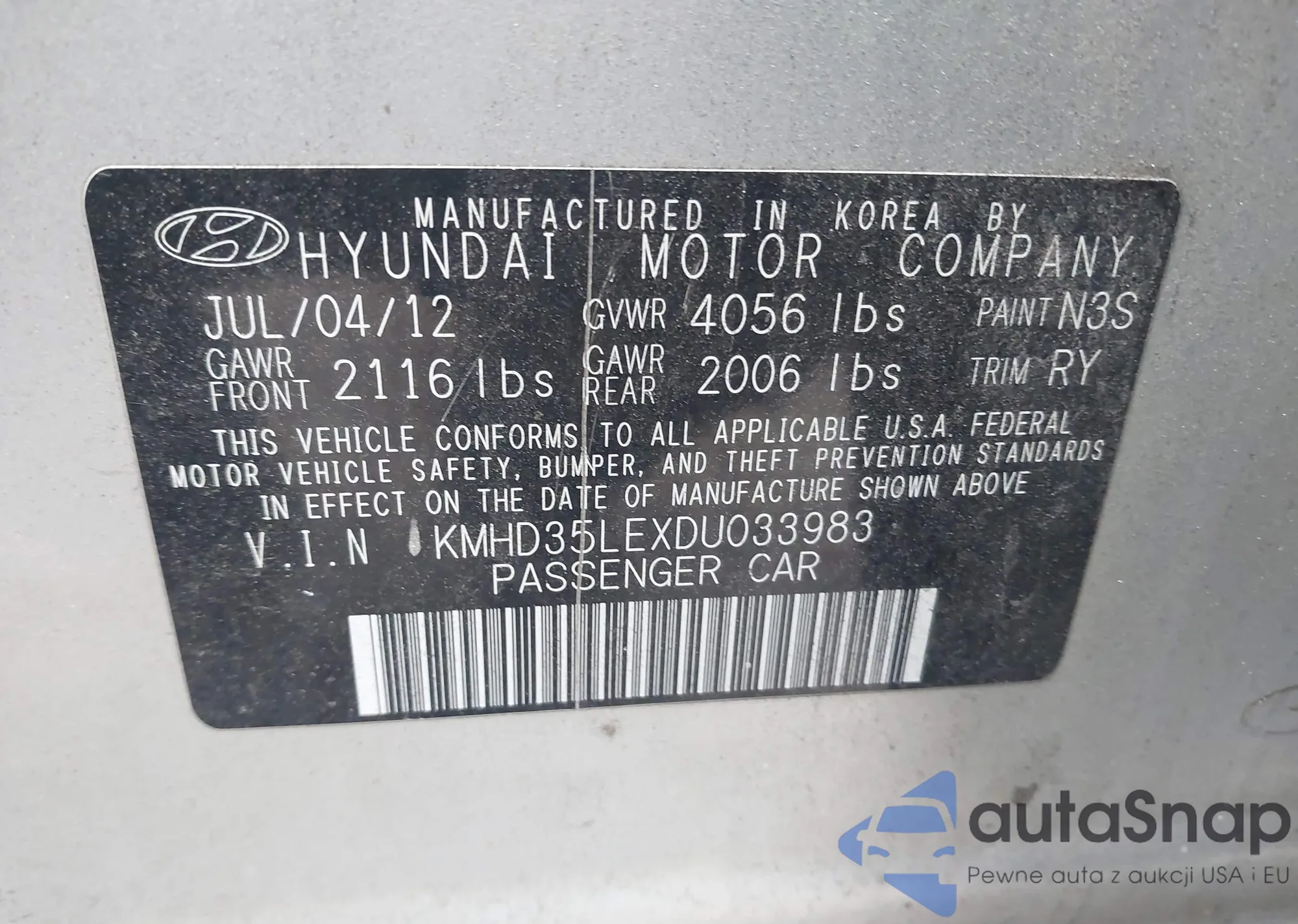 LOT: 43665193 VIN: KMHD35LEXDU033983