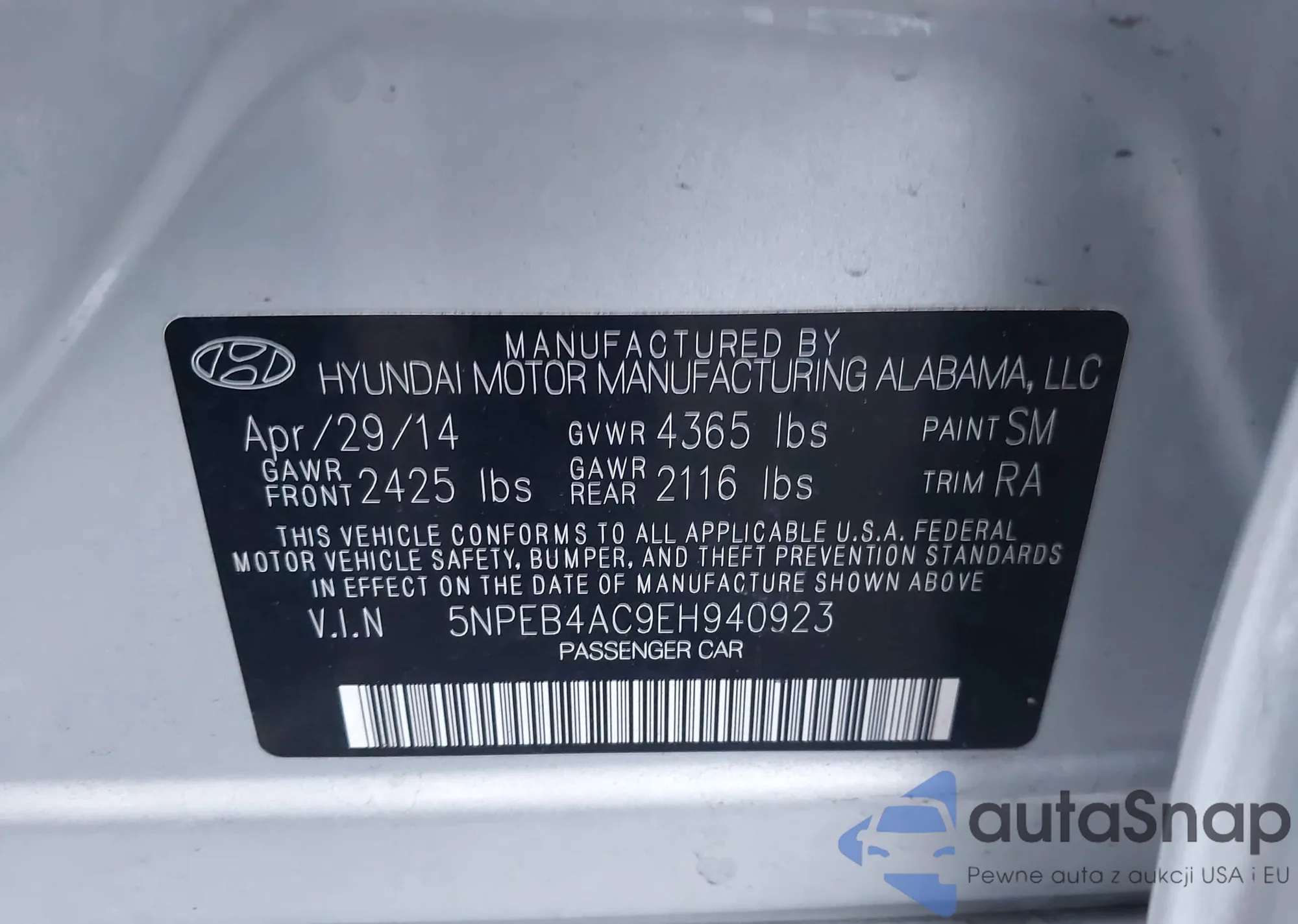 LOT: 43465649 VIN: 5NPEB4AC9EH940923