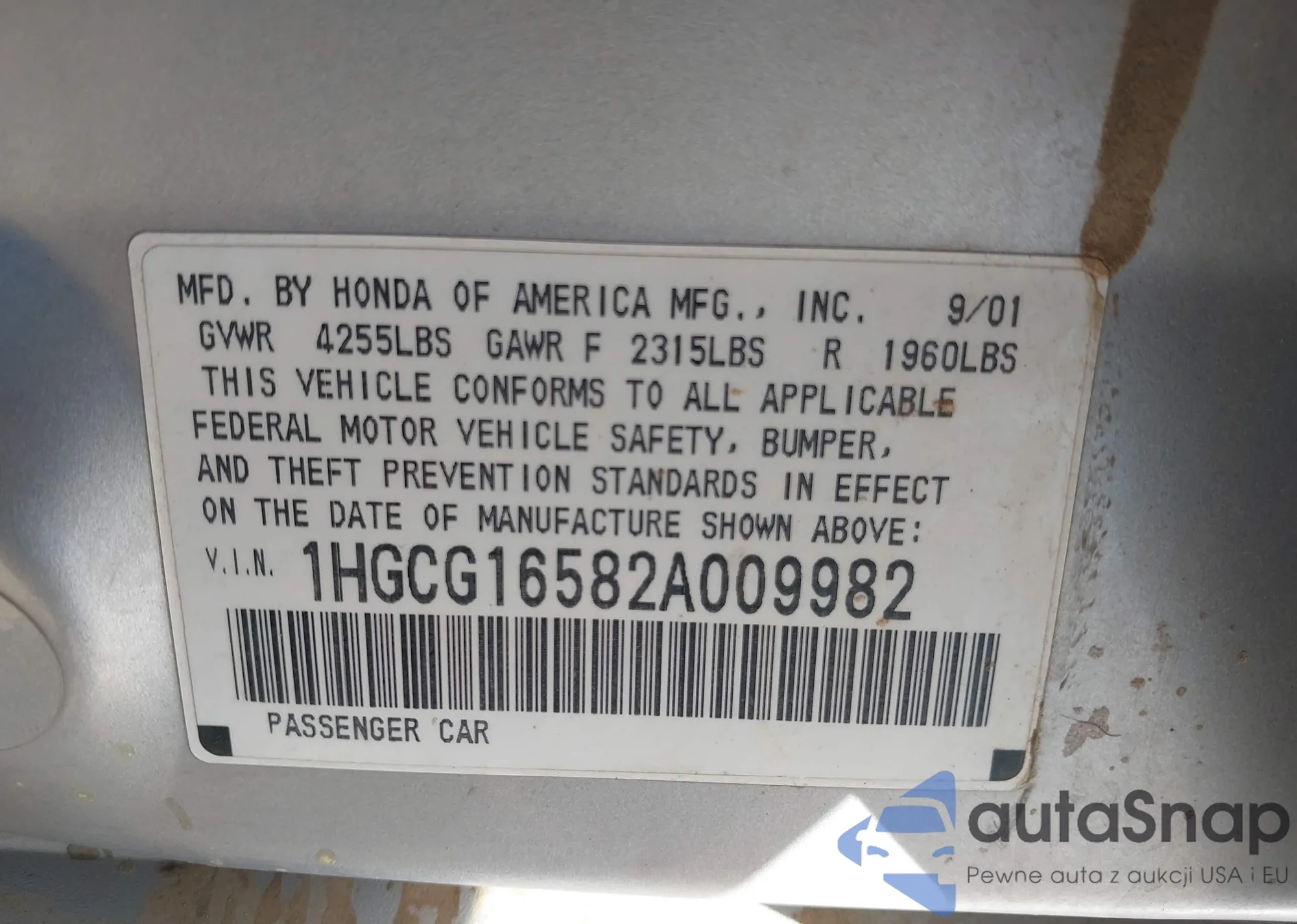 LOT: 43705343 VIN: 1HGCG16582A009982