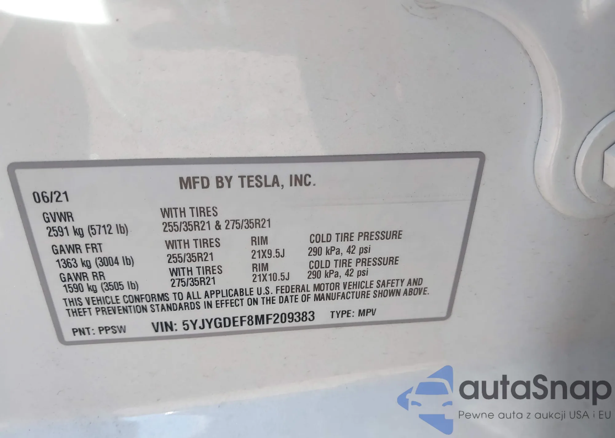 LOT: 43400896 VIN: 5YJYGDEF8MF209383