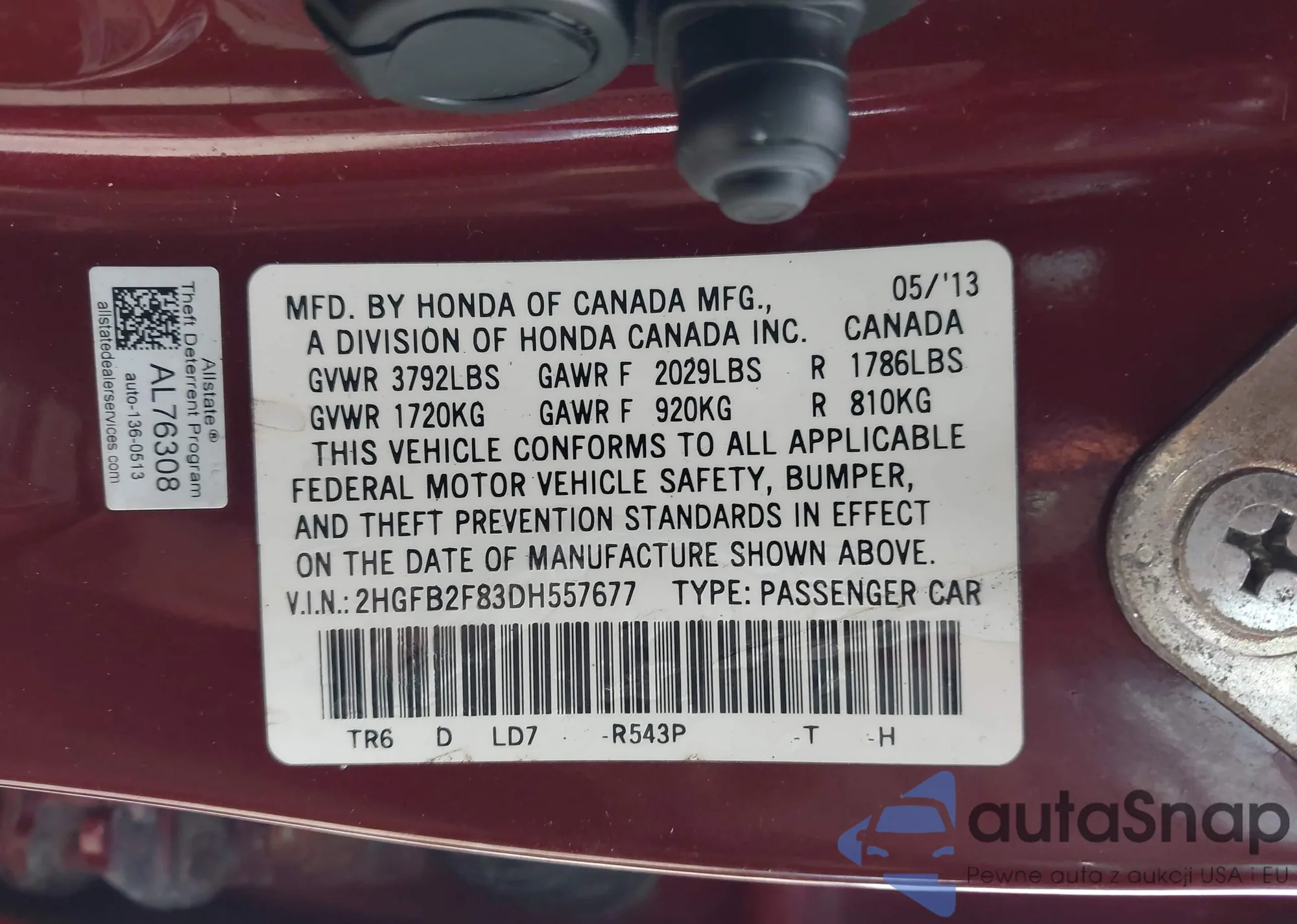 LOT: 43606258 VIN: 2HGFB2F83DH557677