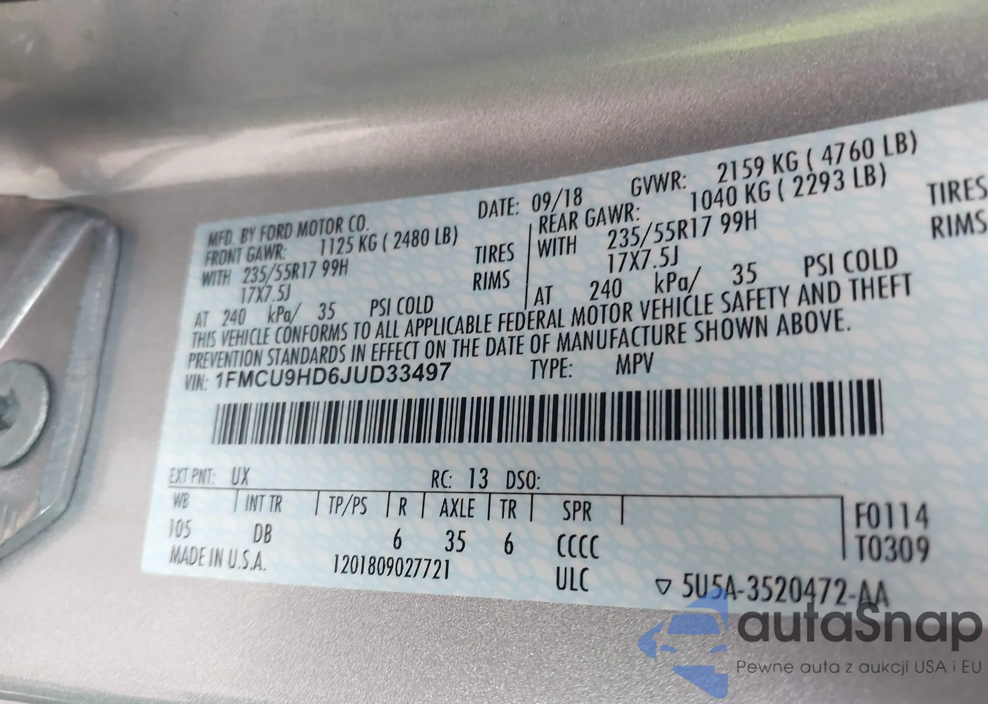 • VIN 1FMCU9HD6JUD33497