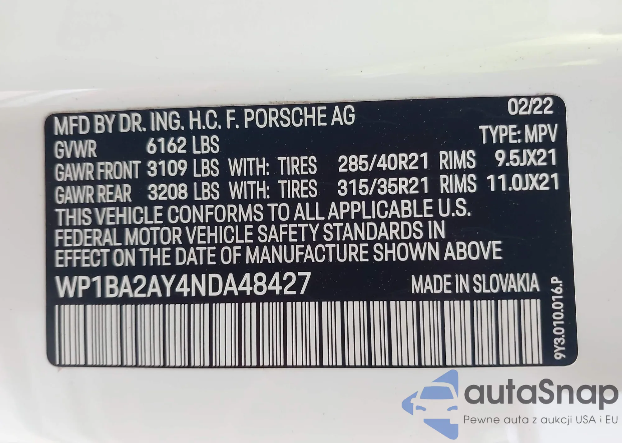LOT: 43212395 VIN: WP1BA2AY4NDA48427