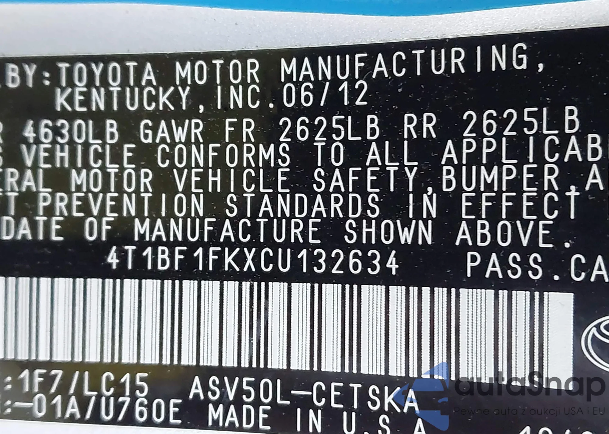 • VIN 4T1BF1FKXCU132634