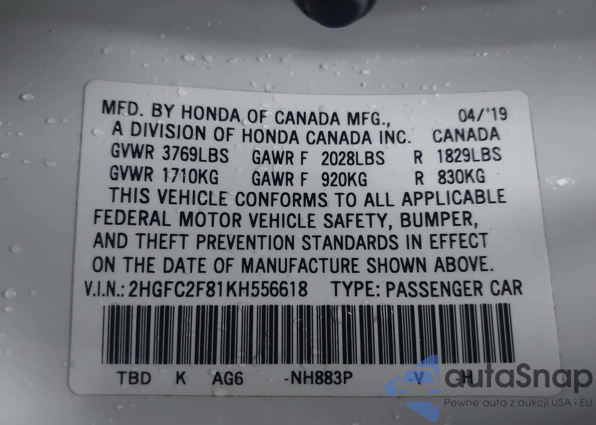 LOT: 43707915 VIN: 2HGFC2F81KH556618