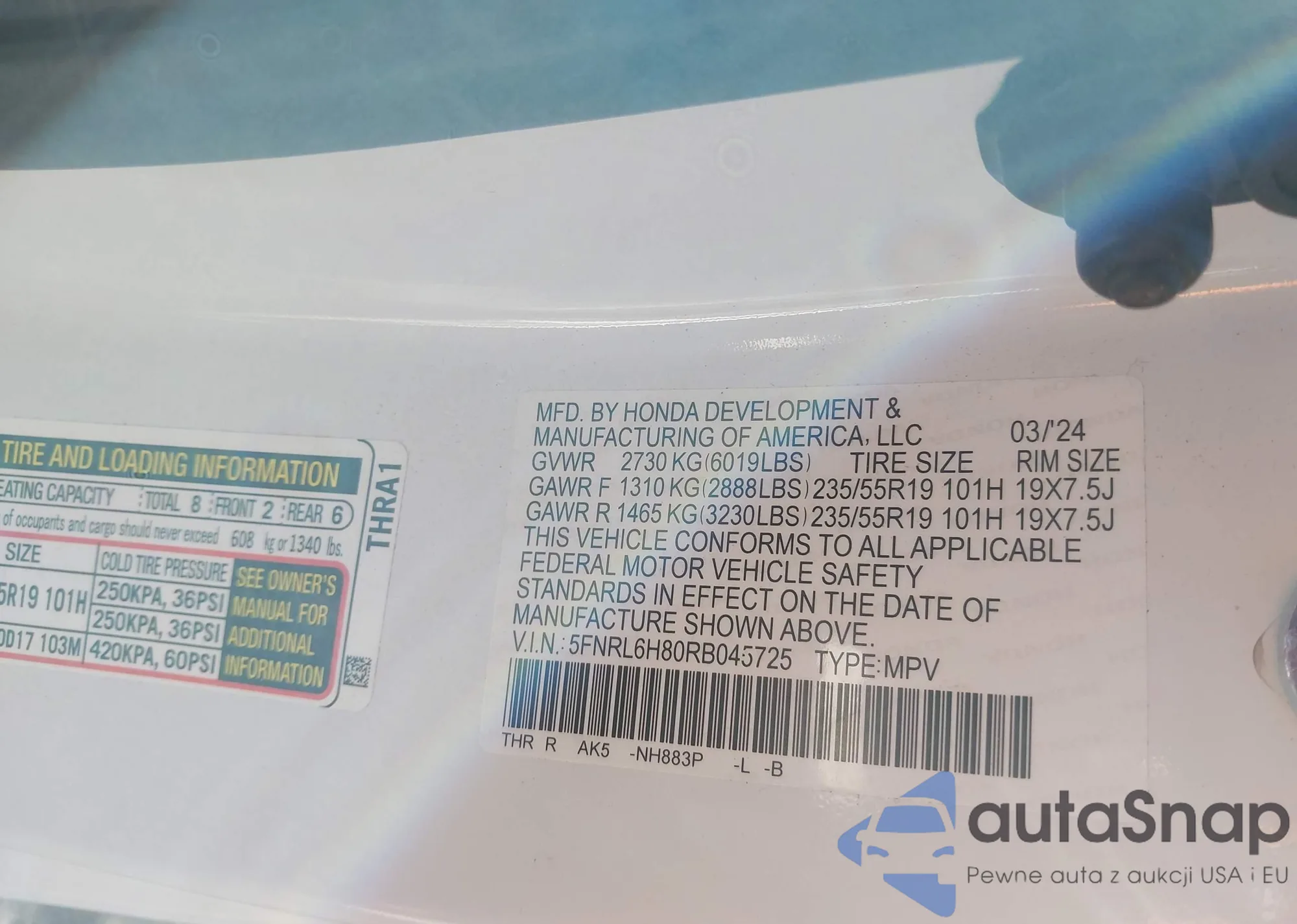 • VIN 5FNRL6H80RB045725