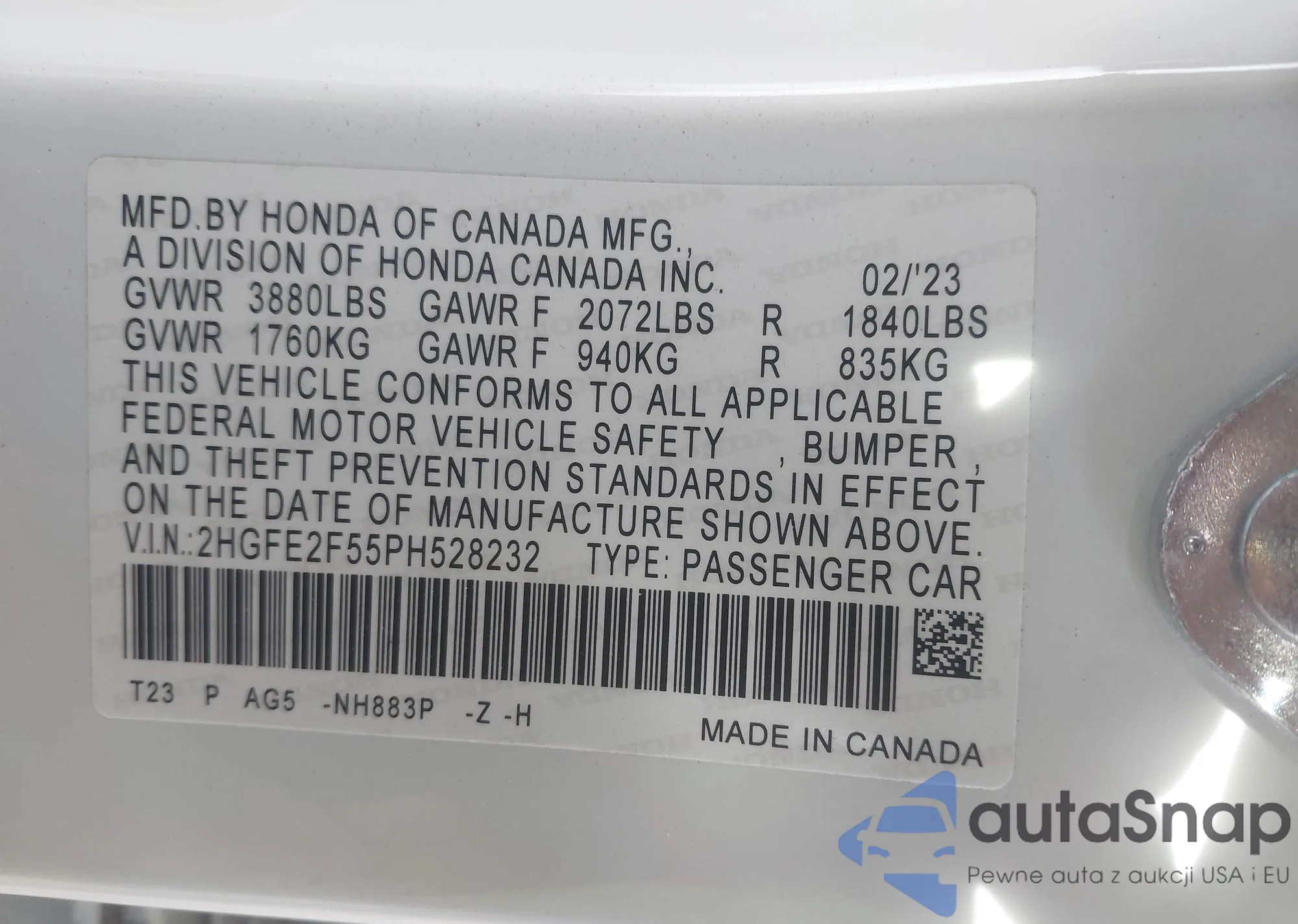 LOT: 43692888 VIN: 2HGFE2F55PH528232