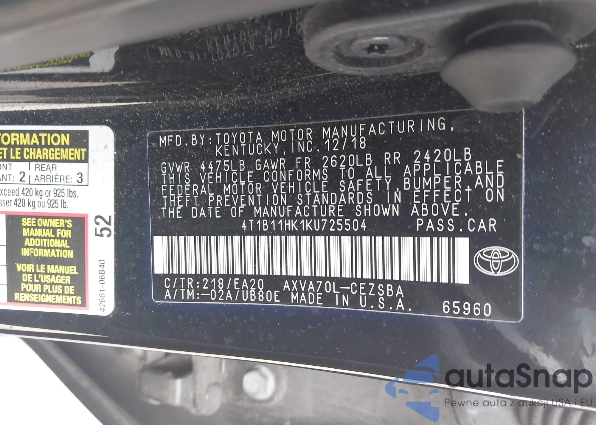 • VIN 4T1B11HK1KU725504