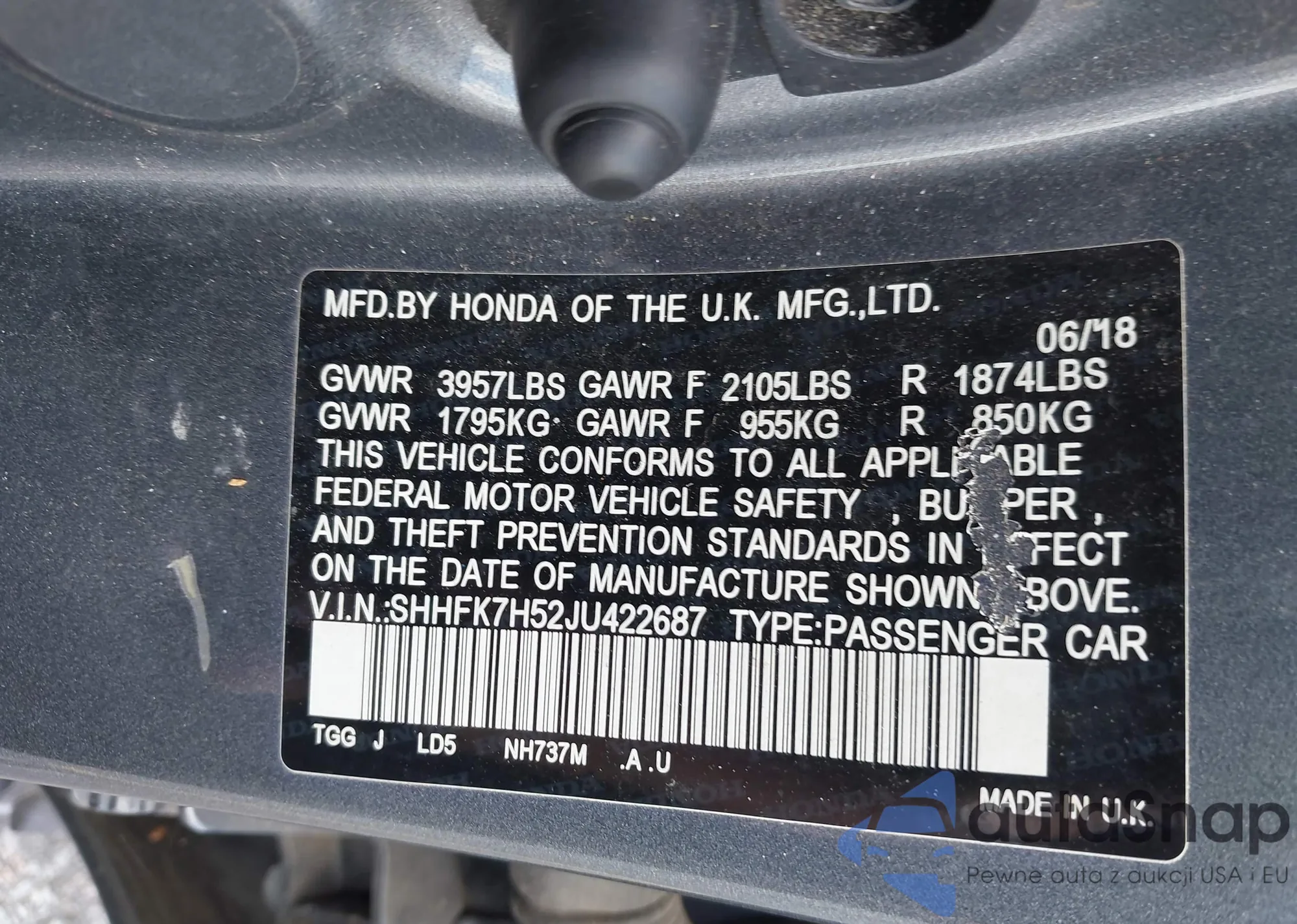 LOT: 42997012 VIN: SHHFK7H52JU422687