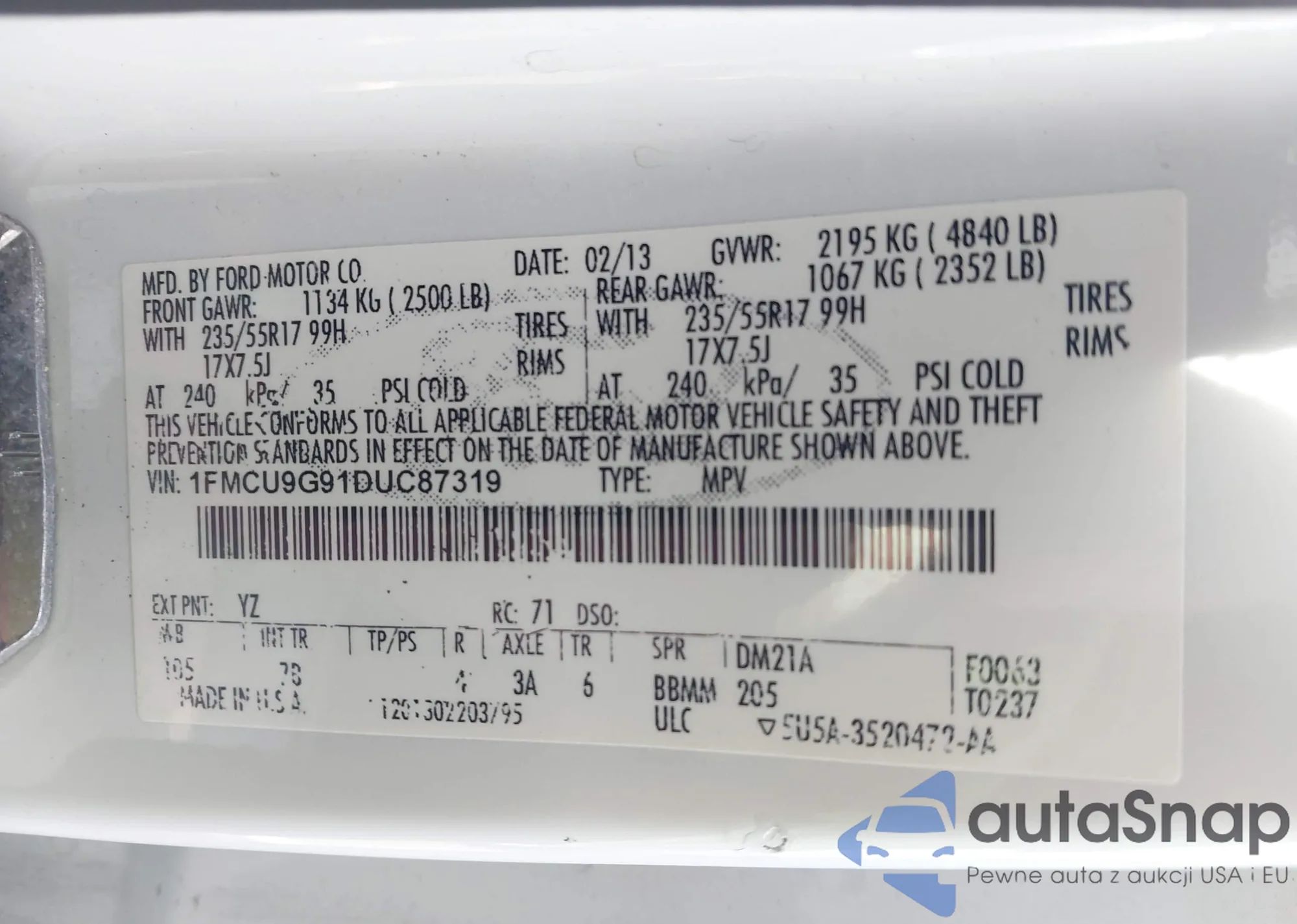 LOT: 43320457 VIN: 1FMCU9G91DUC87319