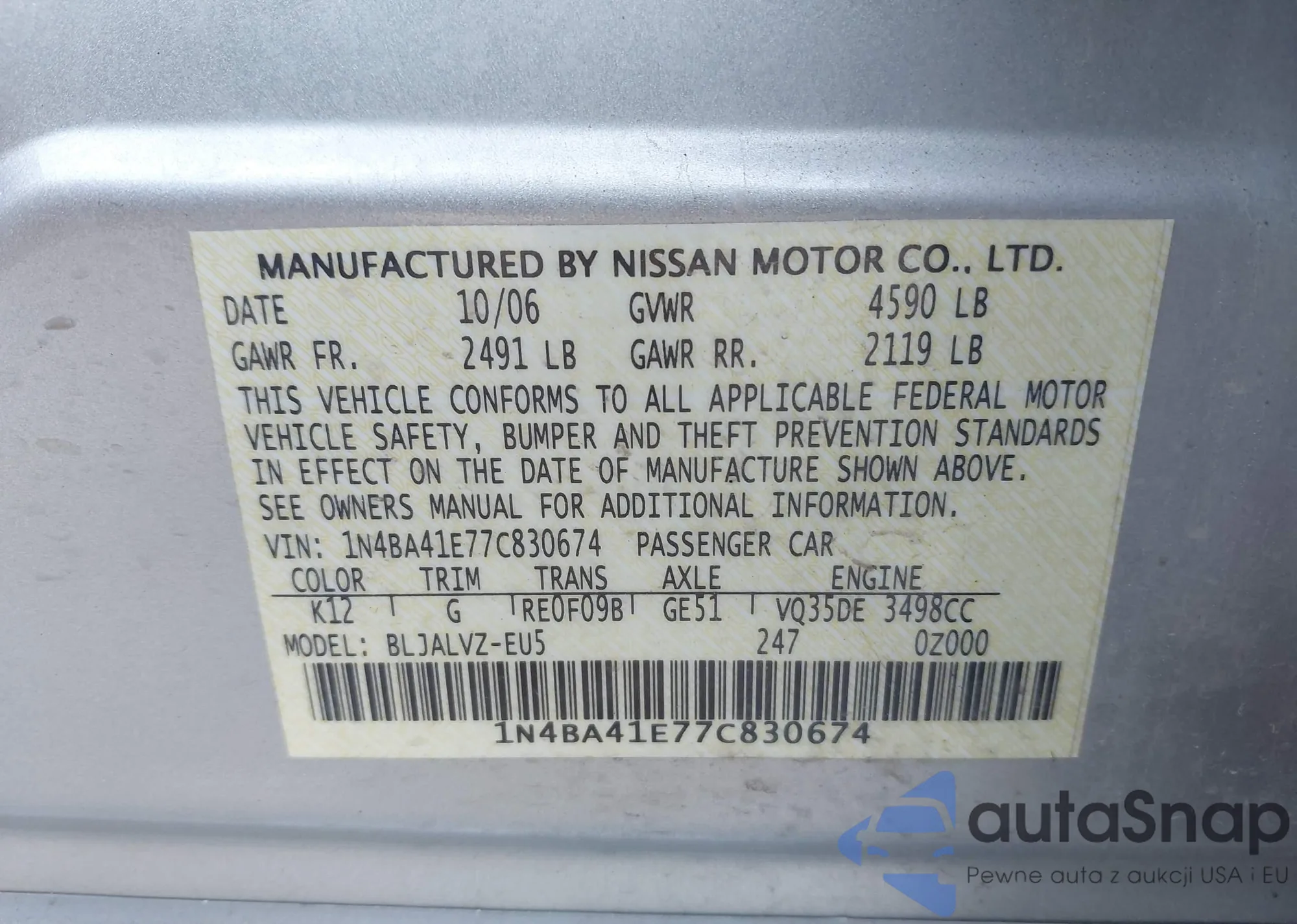 LOT: 43342687 VIN: 1N4BA41E77C830674