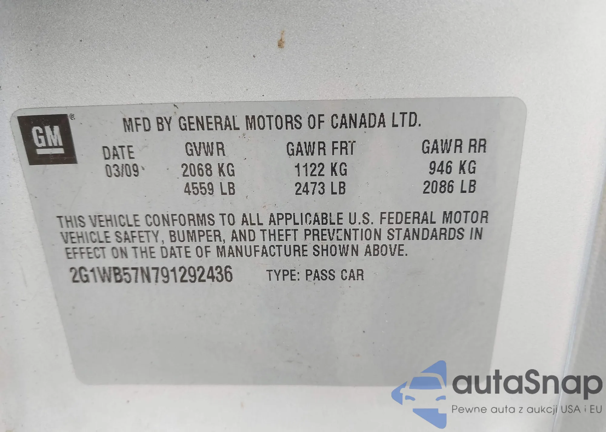LOT: 43503198 VIN: 2G1WB57N791292436