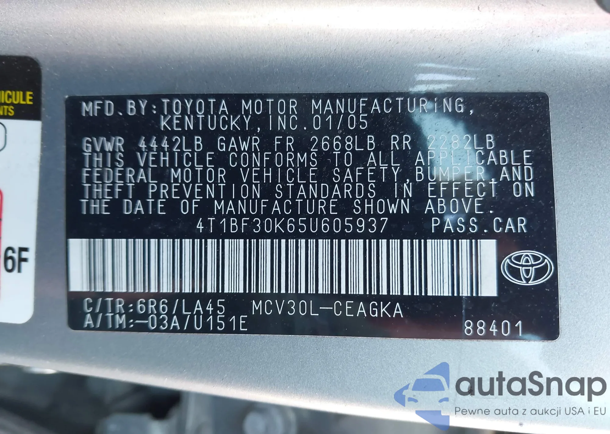 LOT: 39718470 VIN: 4T1BF30K65U605937