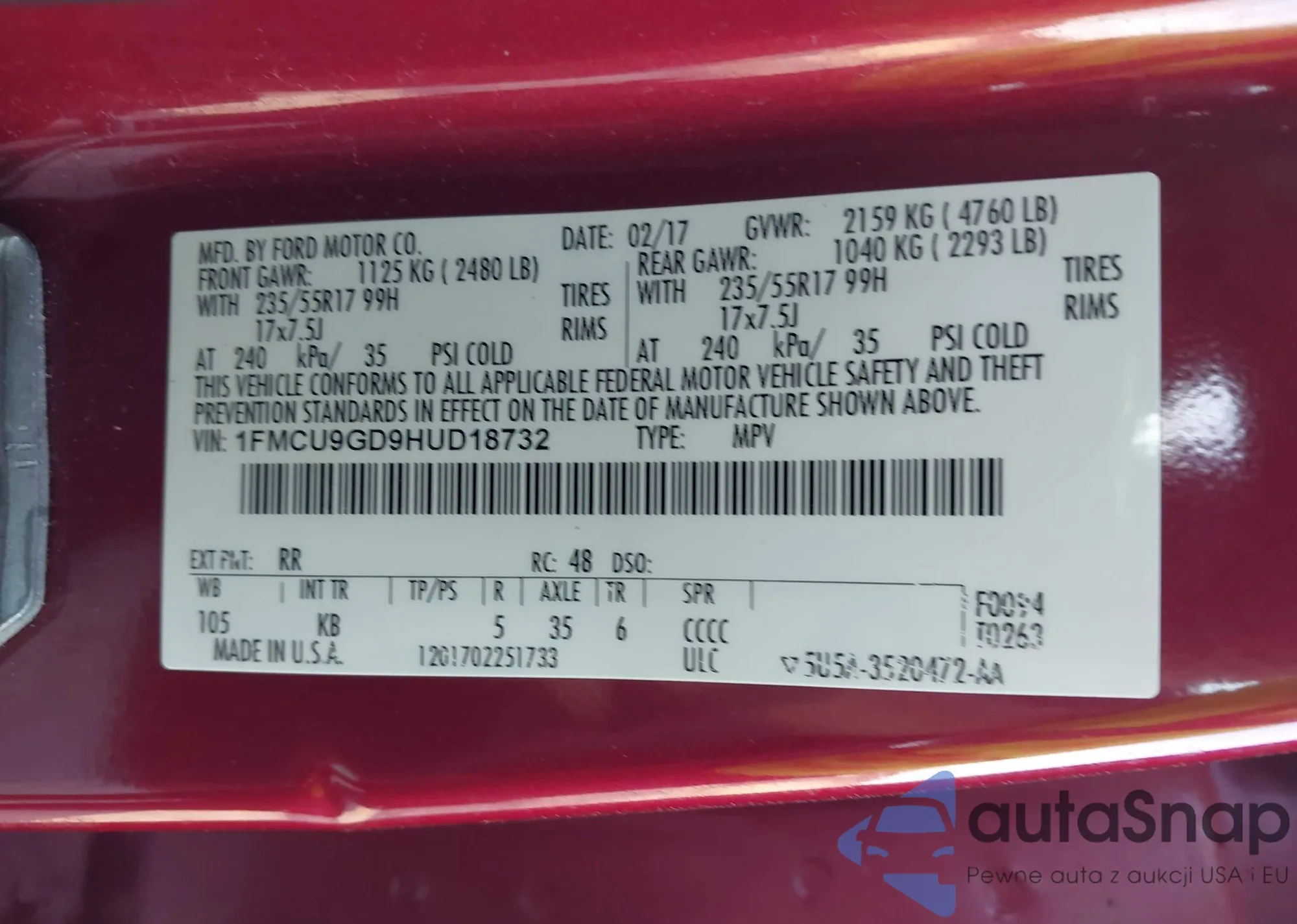 • VIN 1FMCU9GX8DUD08486