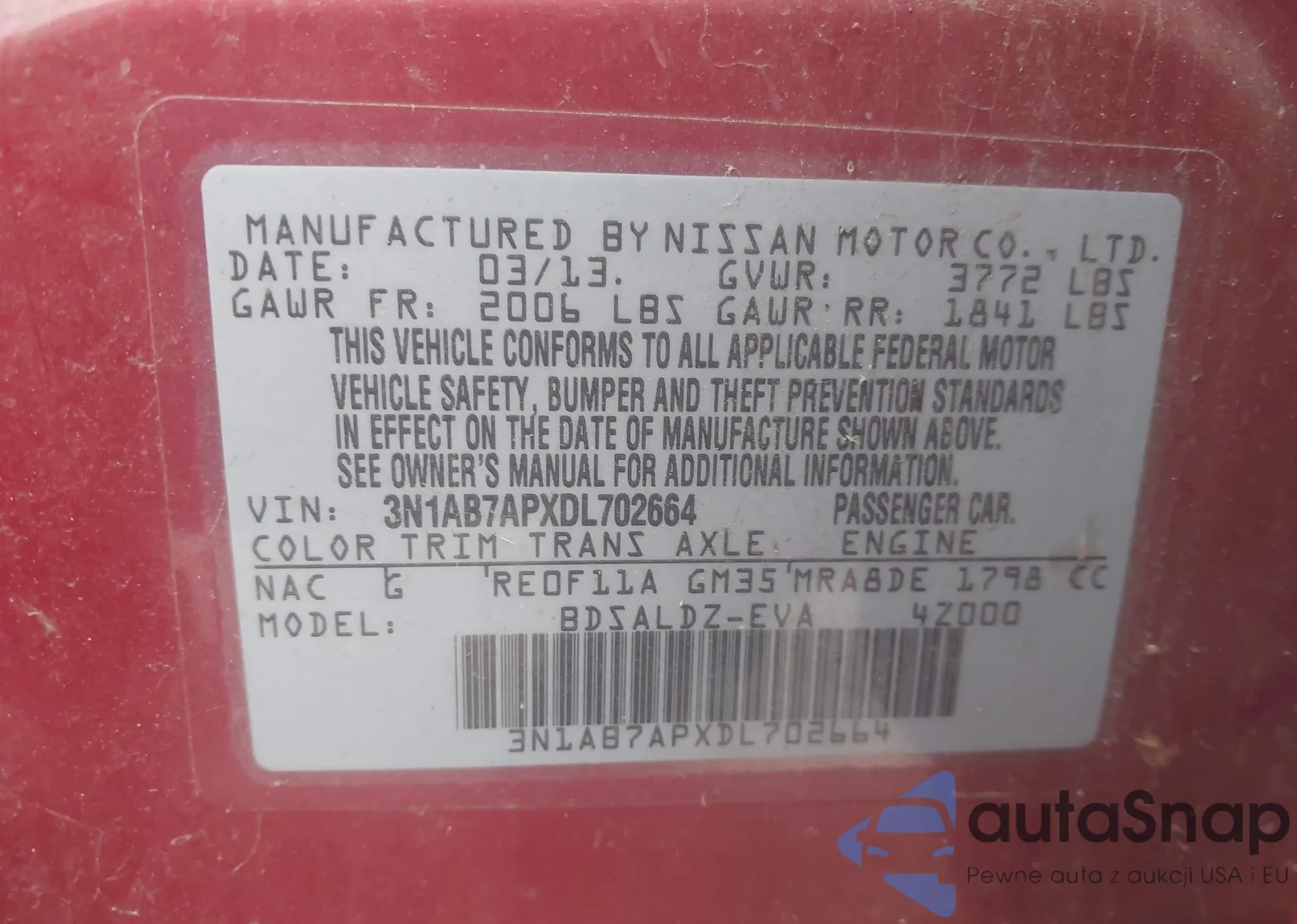 LOT: 43432523 VIN: 3N1AB7APXDL702664