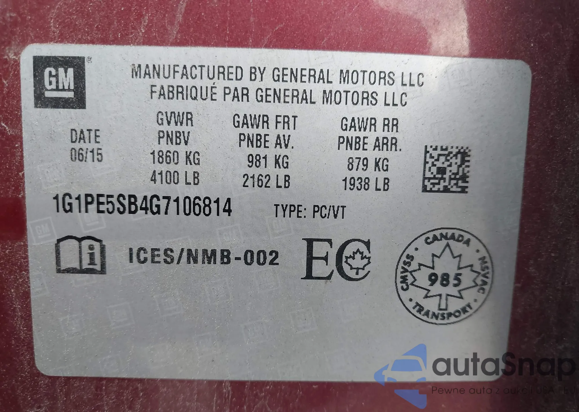 • VIN 2G11Y5SLXE9116071