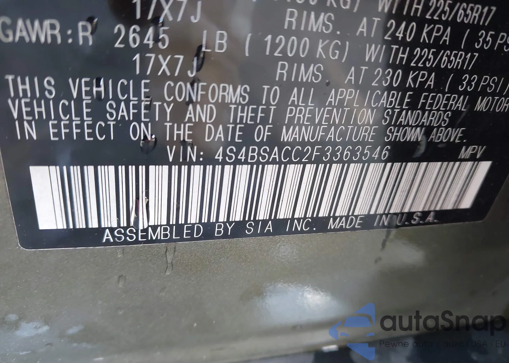 LOT: 43656171 VIN: 4S4BSACC2F3363546