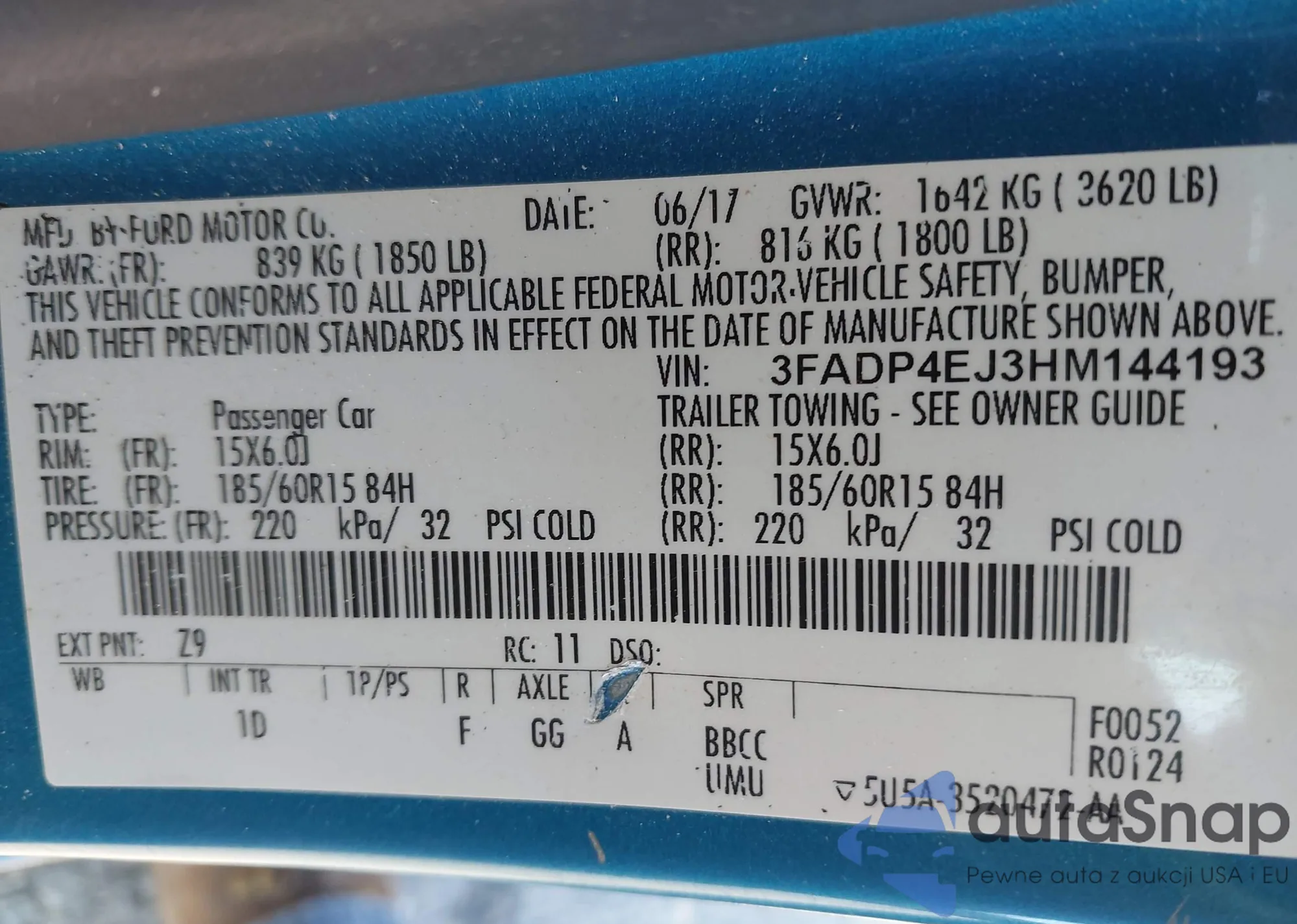 LOT: 43167391 VIN: 3FADP4EJ3HM144193