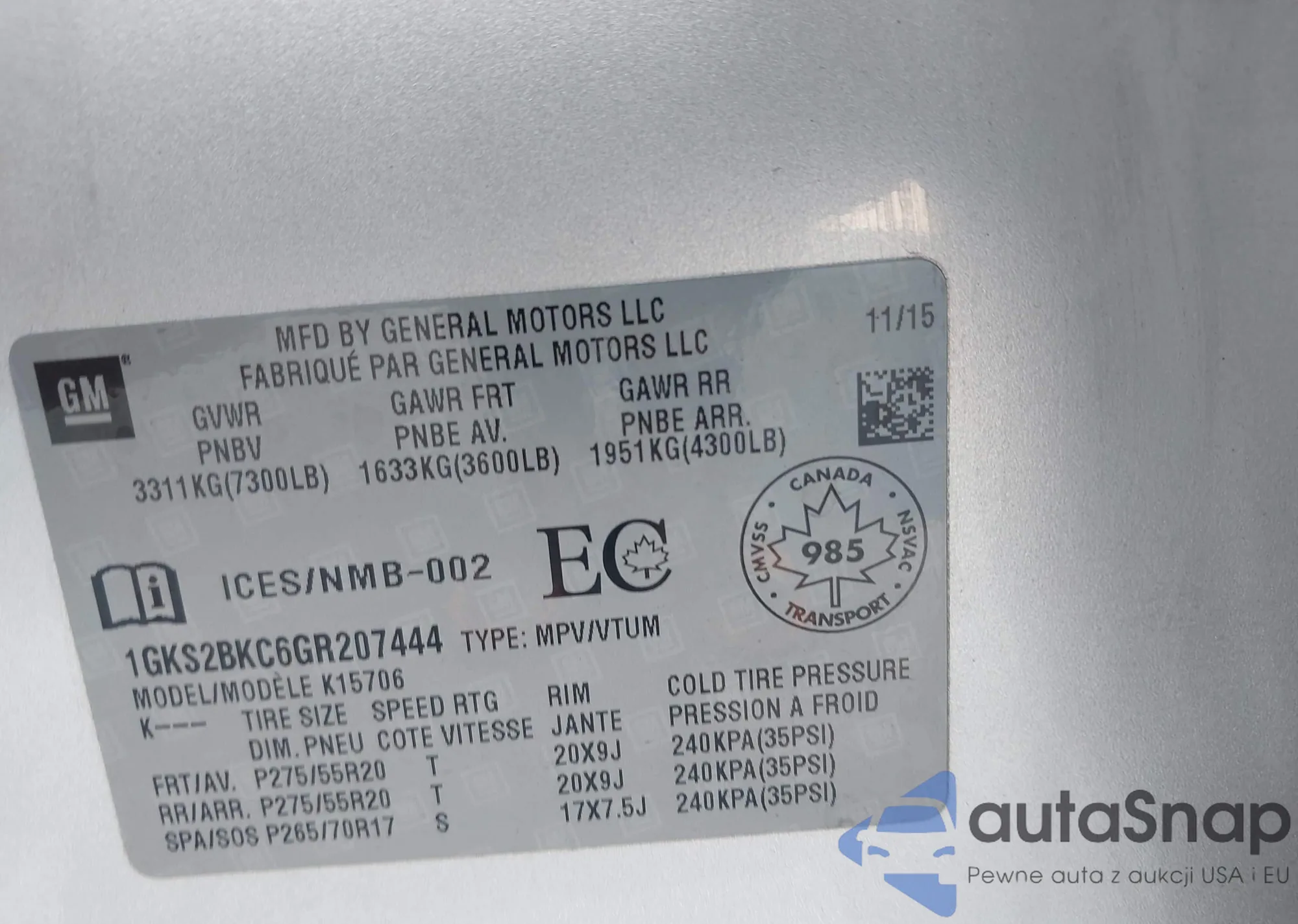• VIN 1GKS2BKC6GR207444