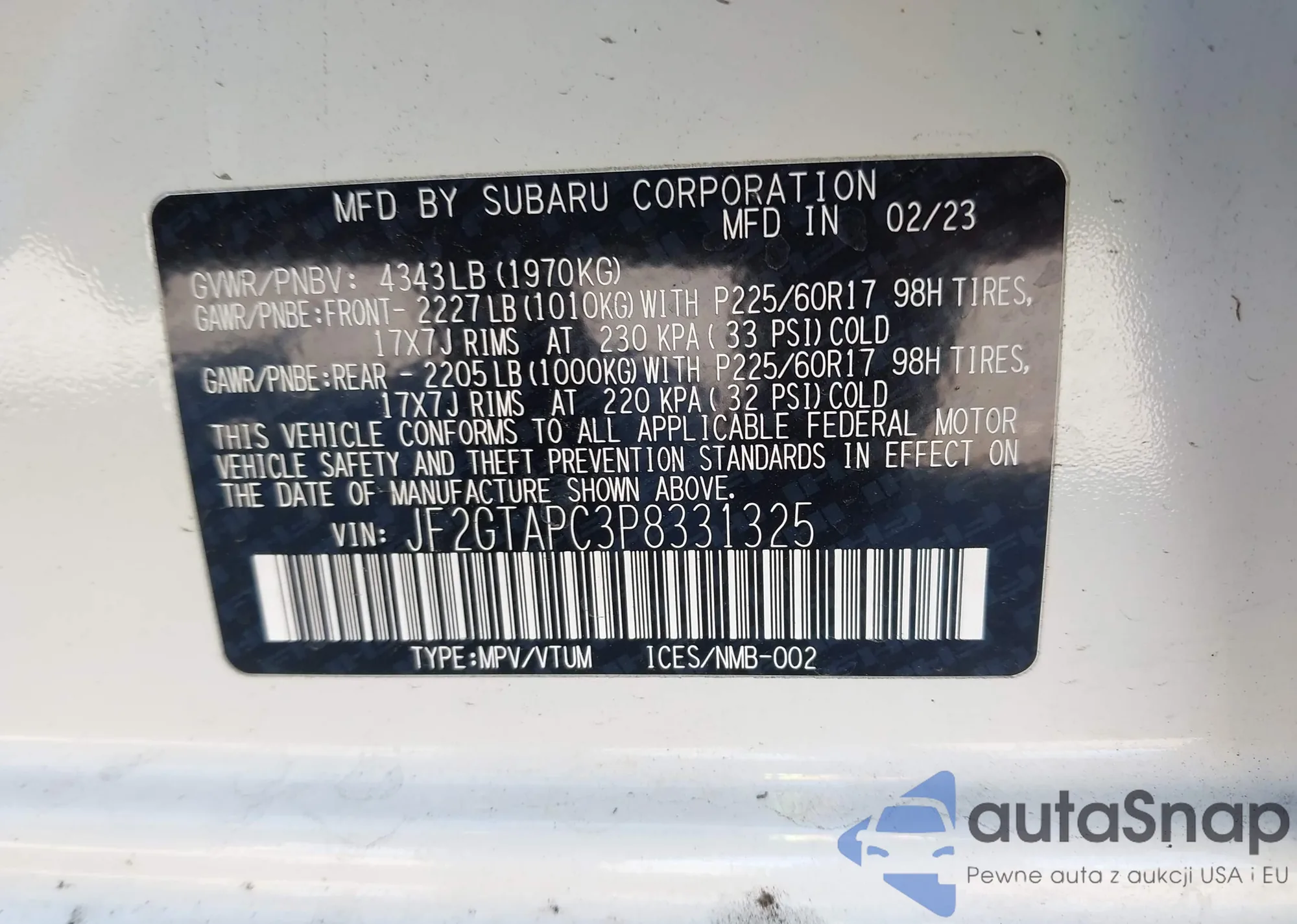 • VIN JF2GTAPC3P8331325