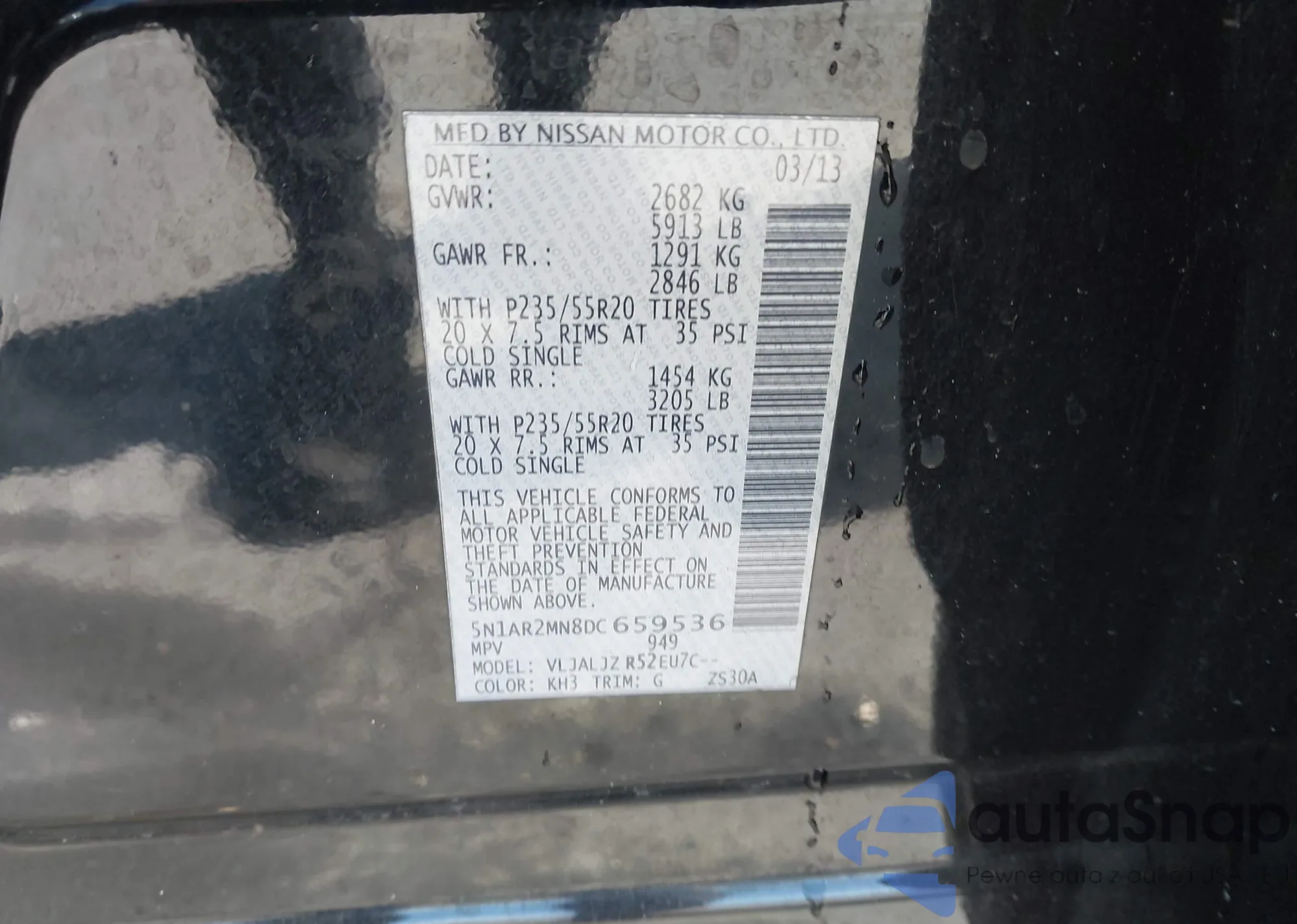 LOT: 43661561 VIN: 5N1AR2MN8DC659536