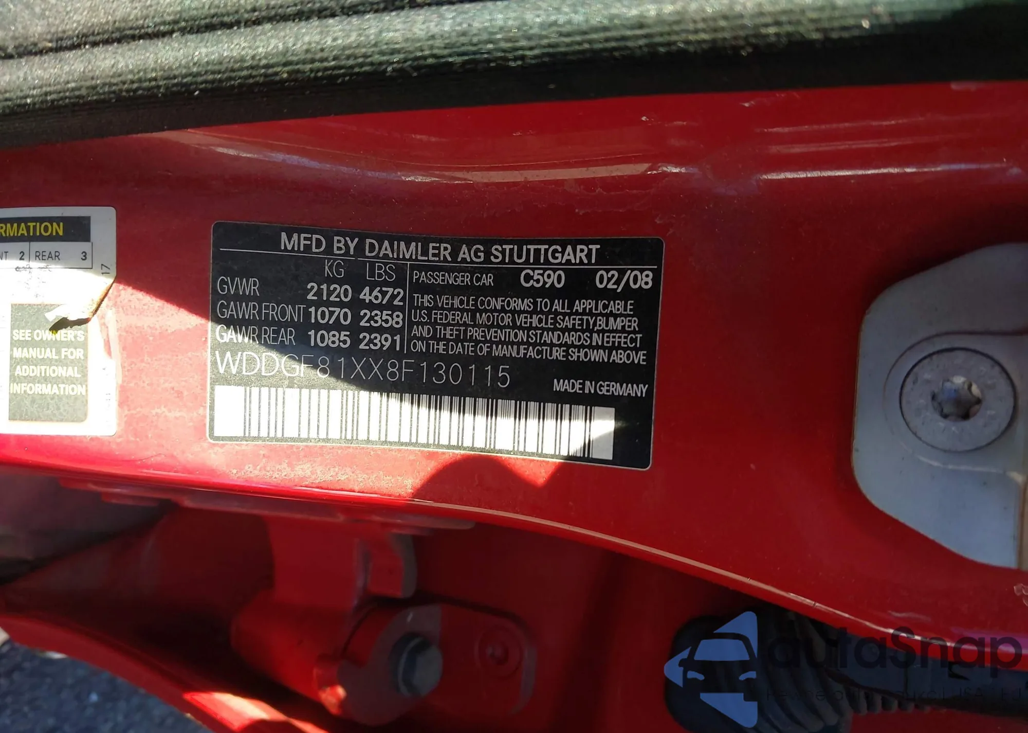 LOT: 43463548 VIN: WDDGF81XX8F130115
