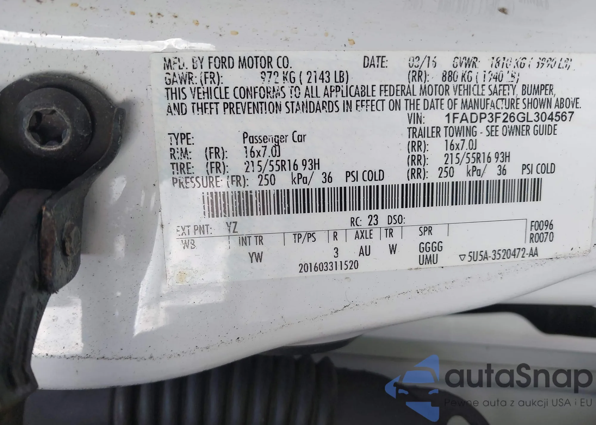 LOT: 43384328 VIN: 1FADP3F26GL304567