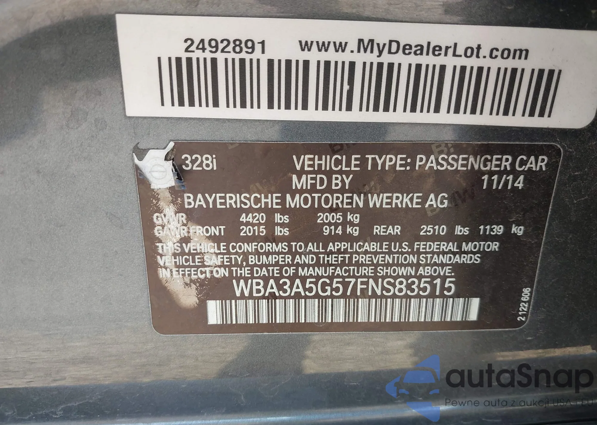 LOT: 43268105 VIN: WBA3A5G57FNS83515