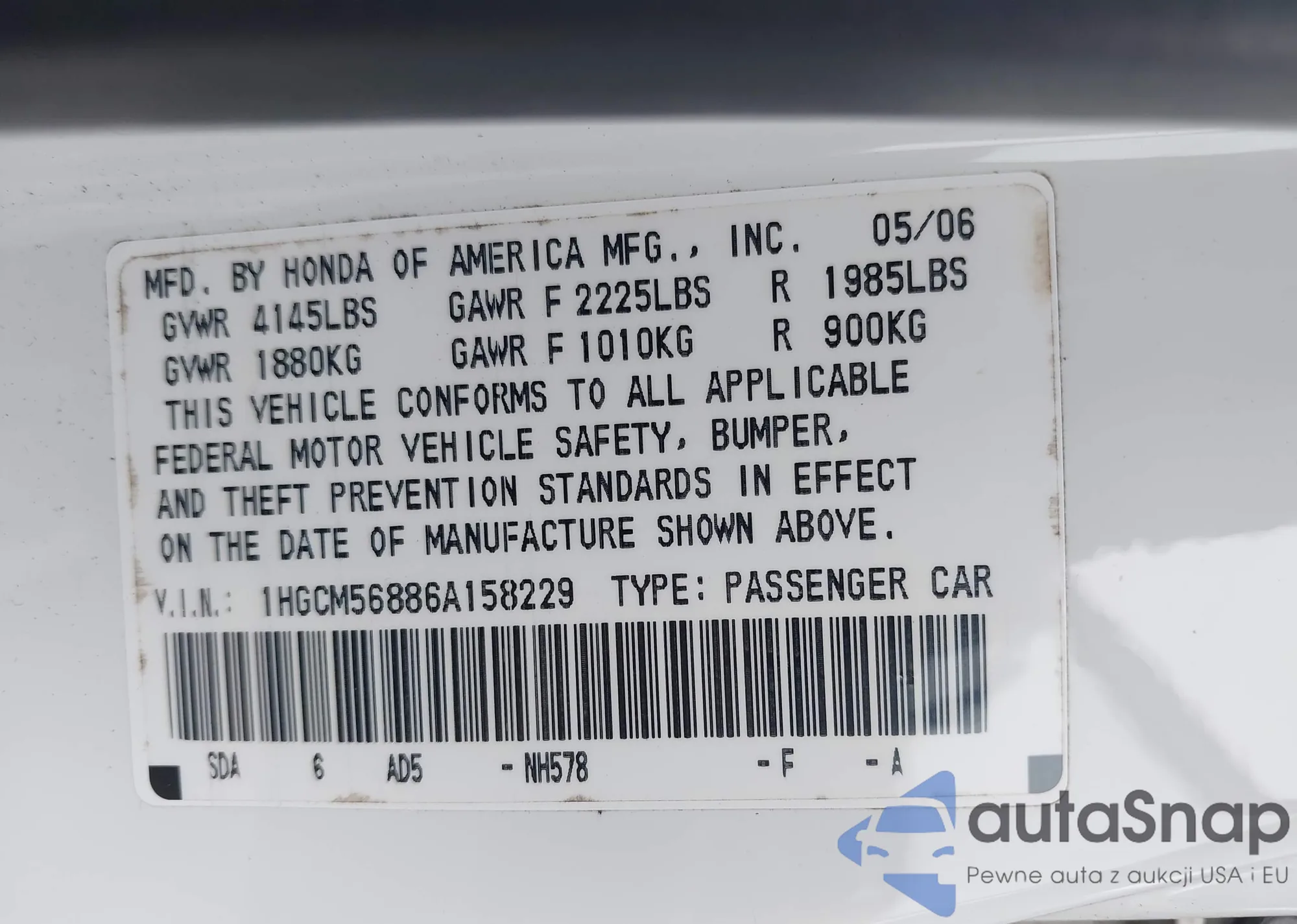 LOT: 43319631 VIN: 1HGCM56886A158229