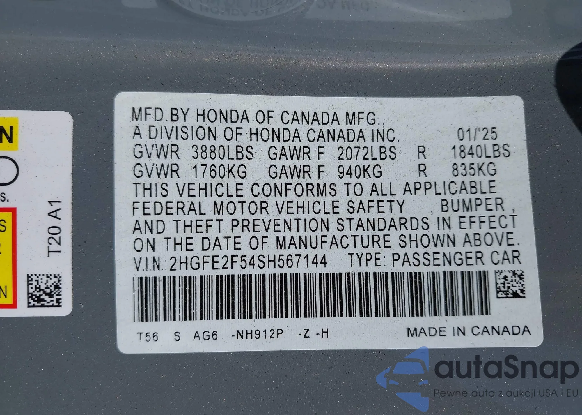 • VIN 2HGFE2F54SH567144