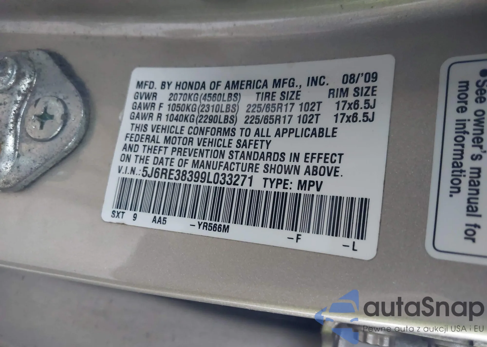 • VIN 5J6RE38399L033271
