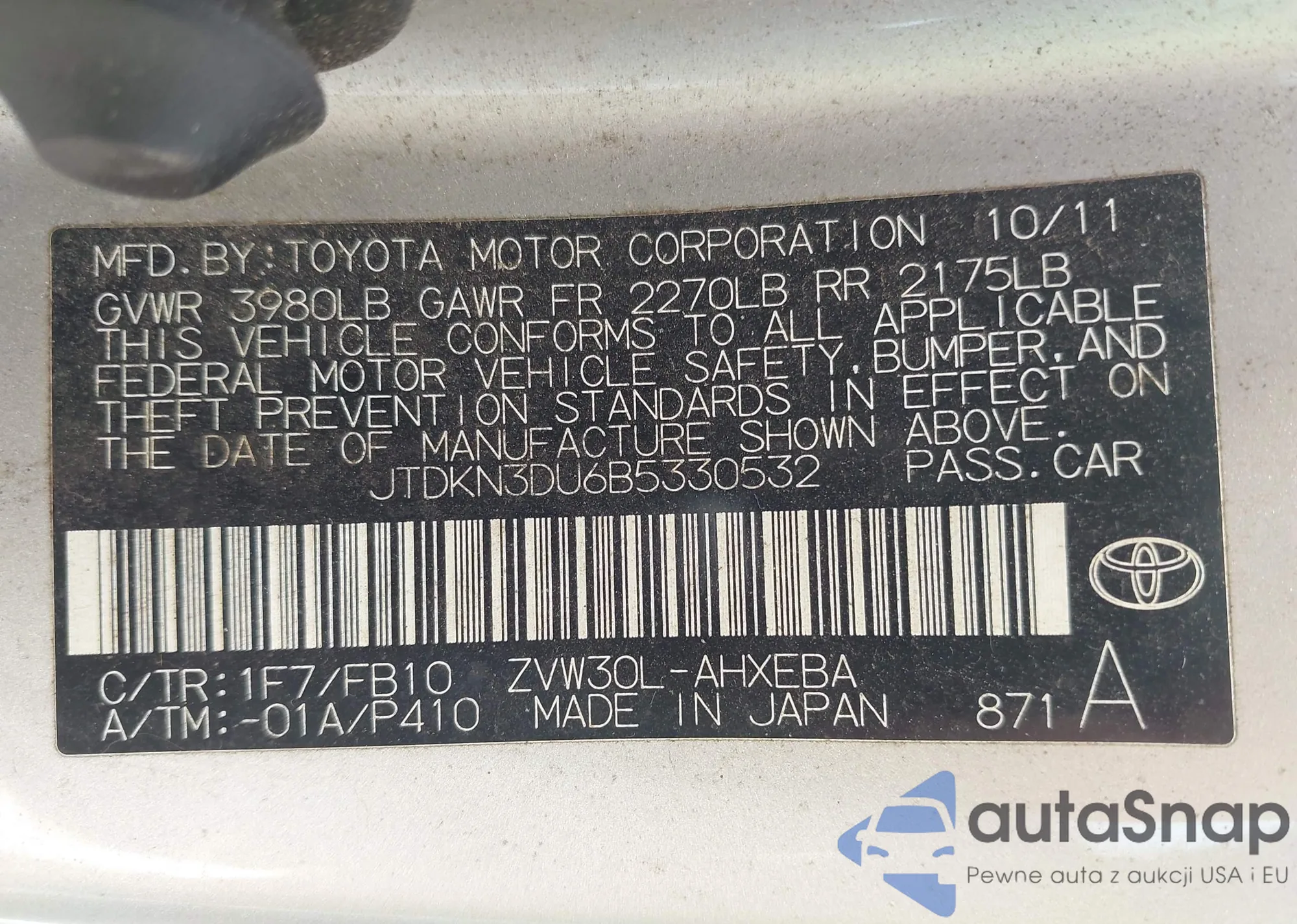 LOT: 43369702 VIN: JTDKN3DU6B5330532