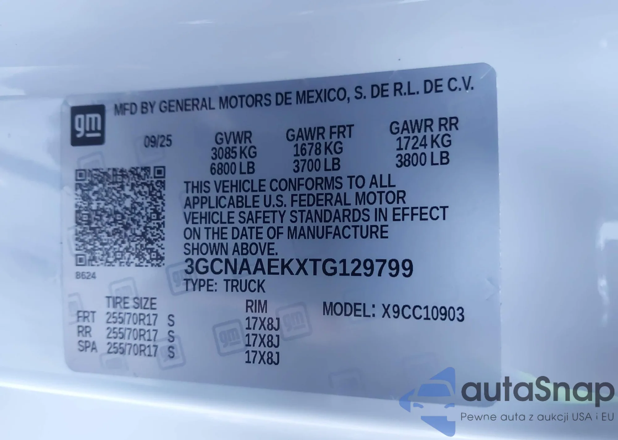 LOT: 43654505 VIN: 3GCNAAEKXTG129799