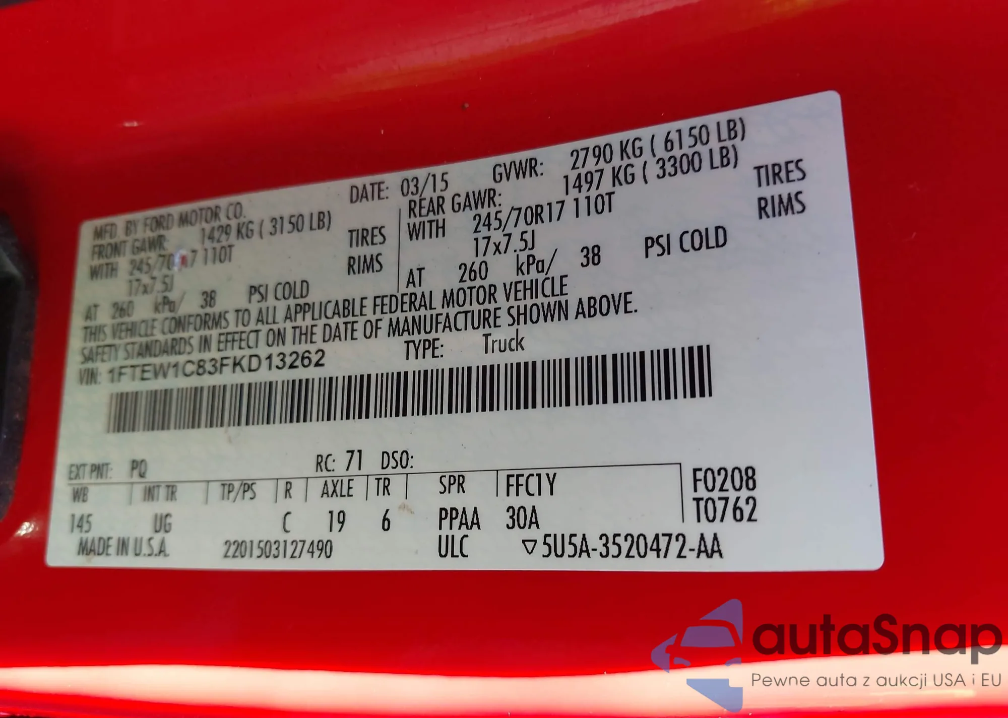 • VIN 1FTEW1C83FKD13262