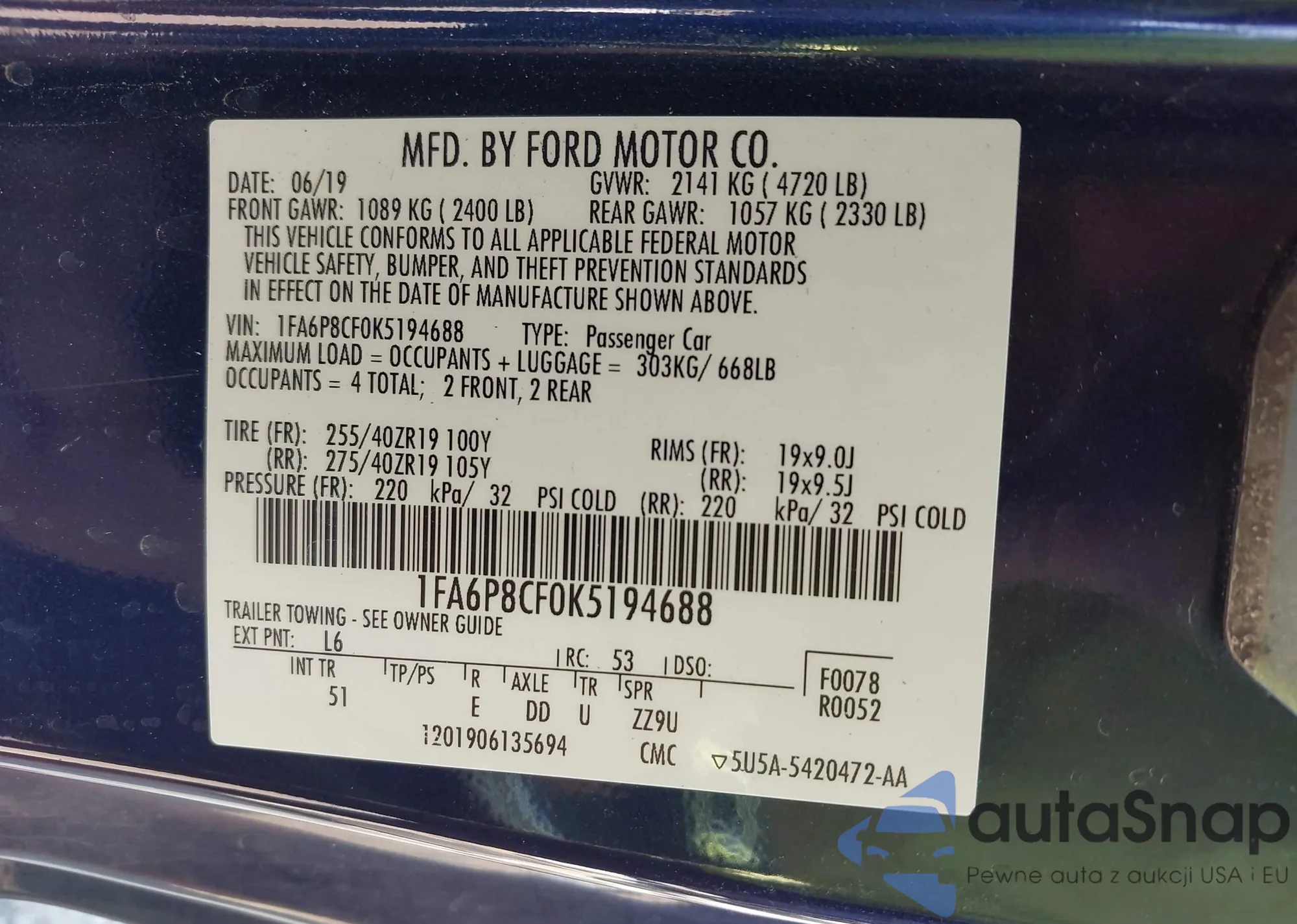 • VIN 1FA6P8CF0K5194688