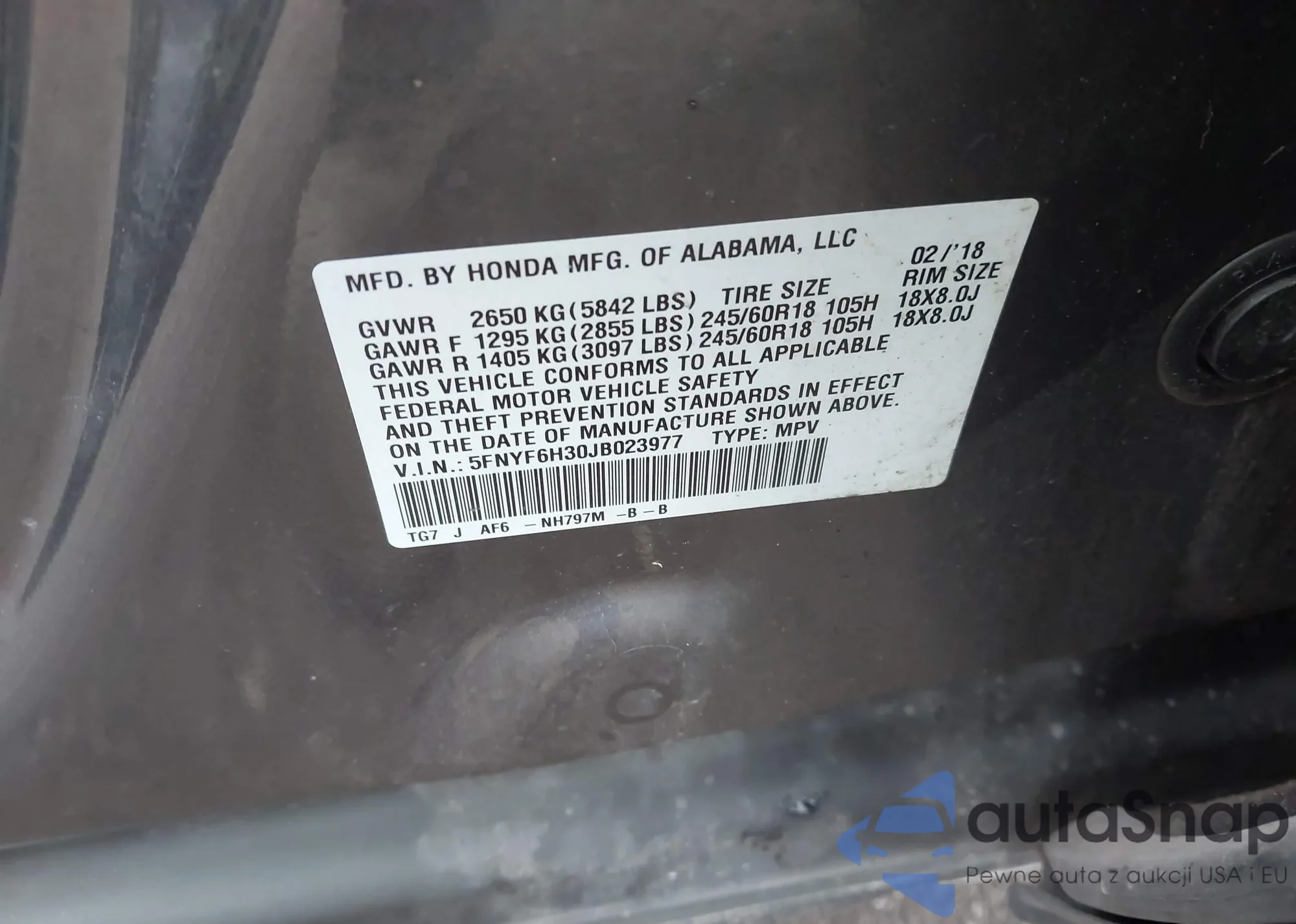 LOT: 42804294 VIN: 5FNYF5H61GB035262