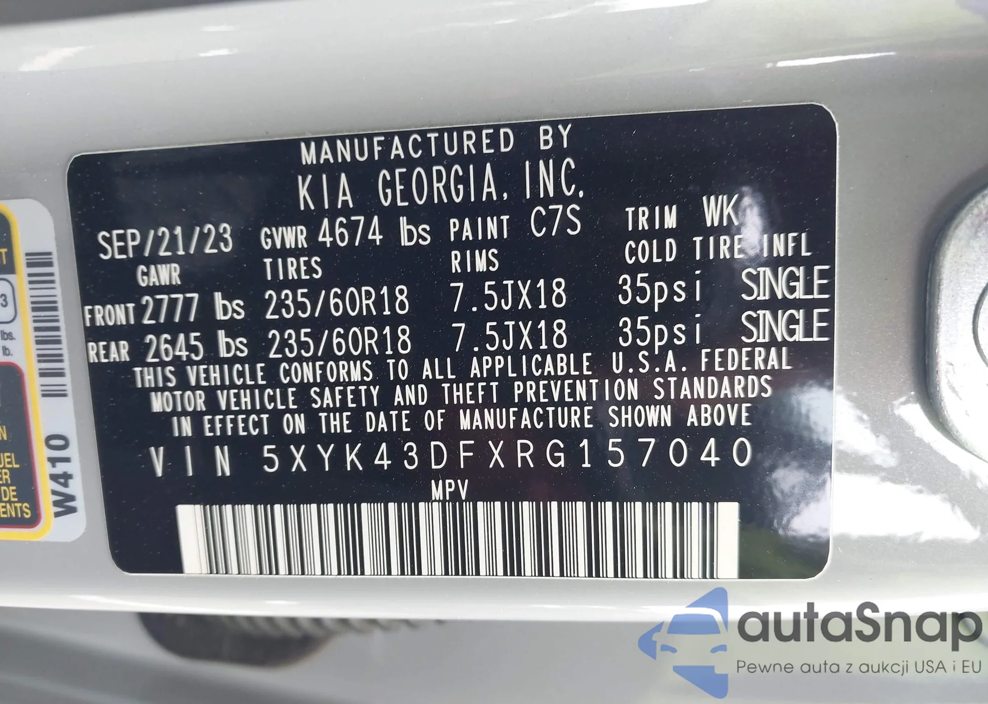 • VIN 5XYK43DFXRG157040