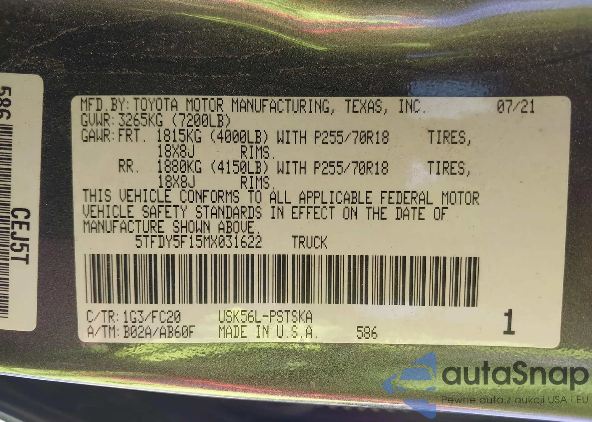 LOT: 43320209 VIN: 5TFDY5F15MX031622