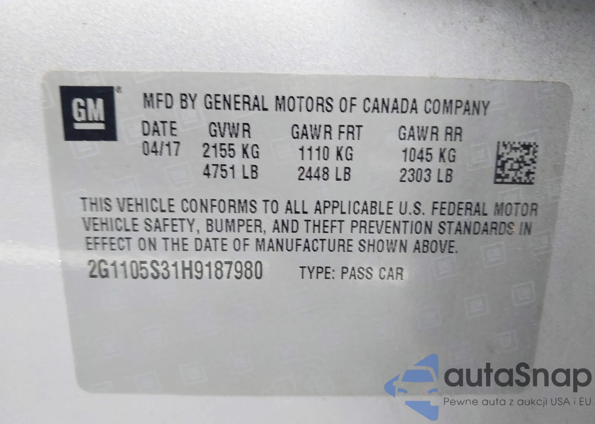 • VIN 2G1105S31H9187980
