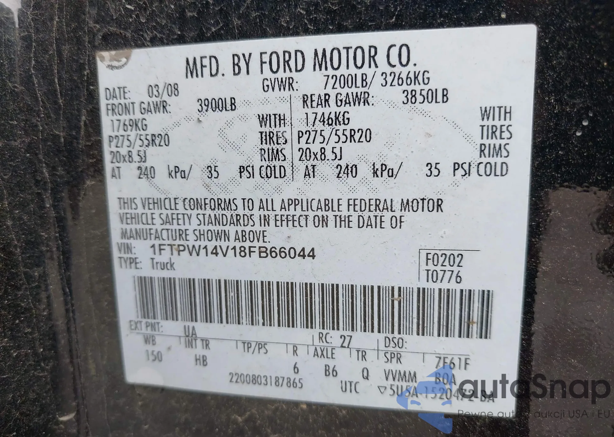 LOT: 43078395 VIN: 1FTPW14V18FB66044