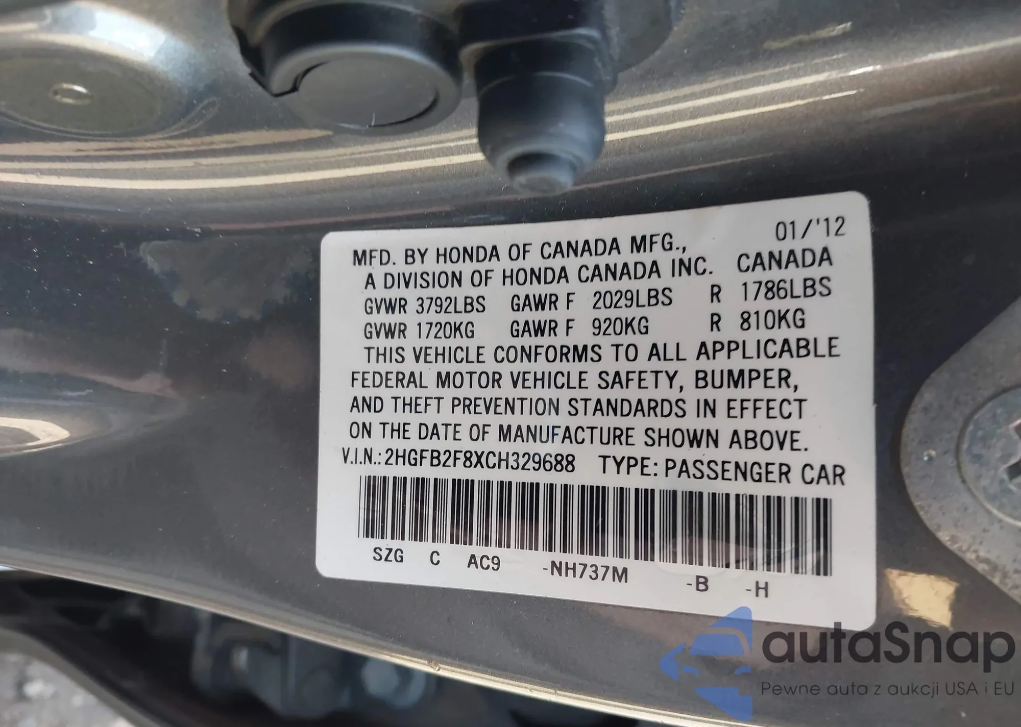 LOT: 43713430 VIN: 2HGFB2F8XCH329688