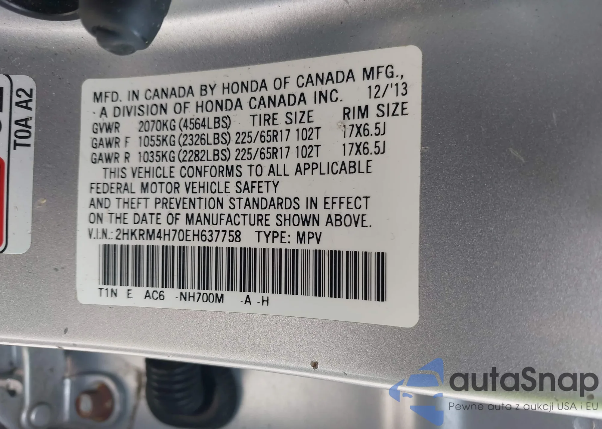 • VIN 2HKRM4H70EH637758