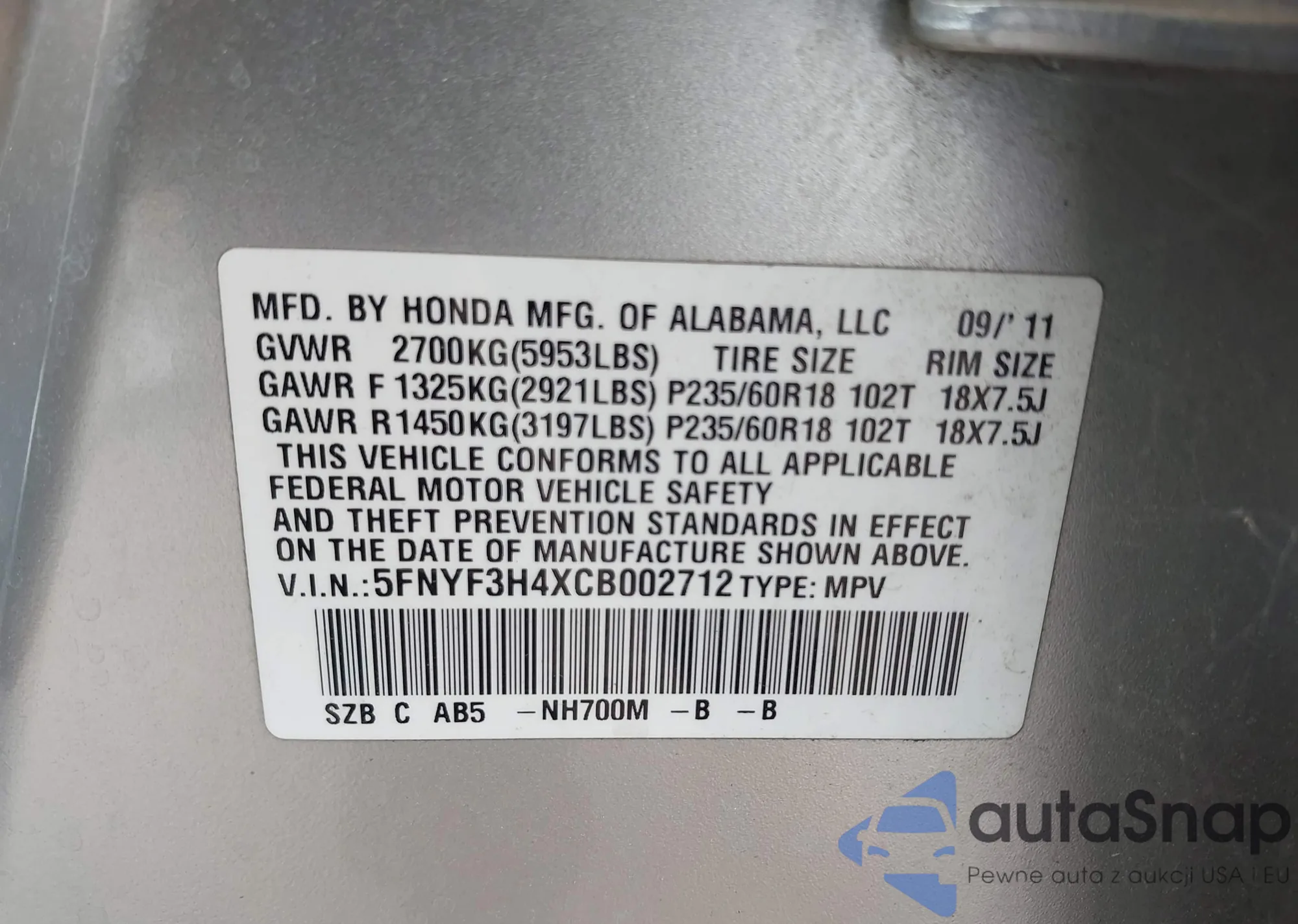 • VIN 5FNYF3H4XCB002712